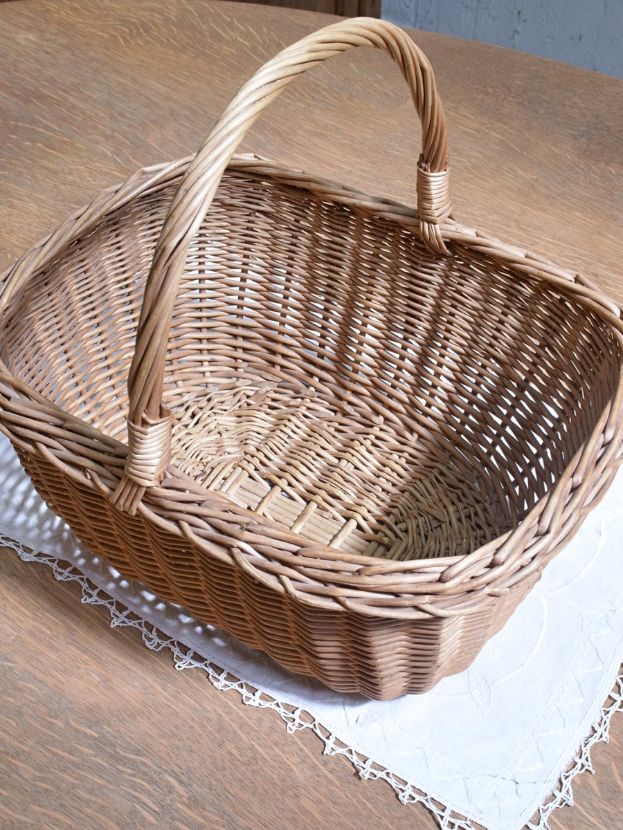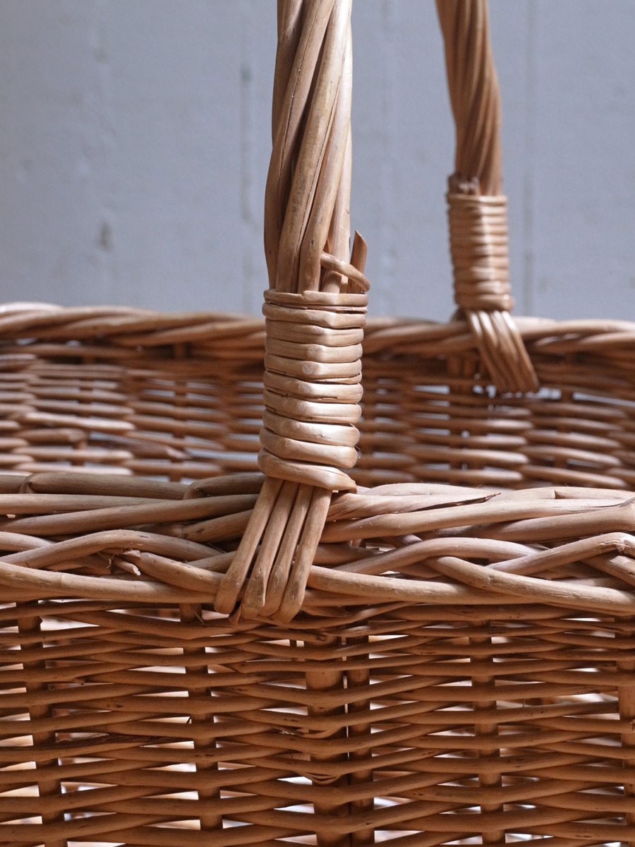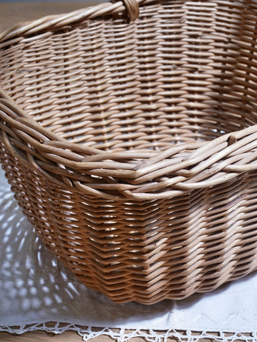 イギリス製のアンティークバスケットは、ちょうど良いサイズ感で、小物の収納に最適です。雑誌や新聞などの収納はもちろん、スリッパやスカーフなどのファッション小物の収納にもおすすめです。取っ手があり、持ち運びができます。とっても軽く、持ち運びしやすいです。編み目はスタンダードなデザインです。その他バスケット一覧はこちらから。