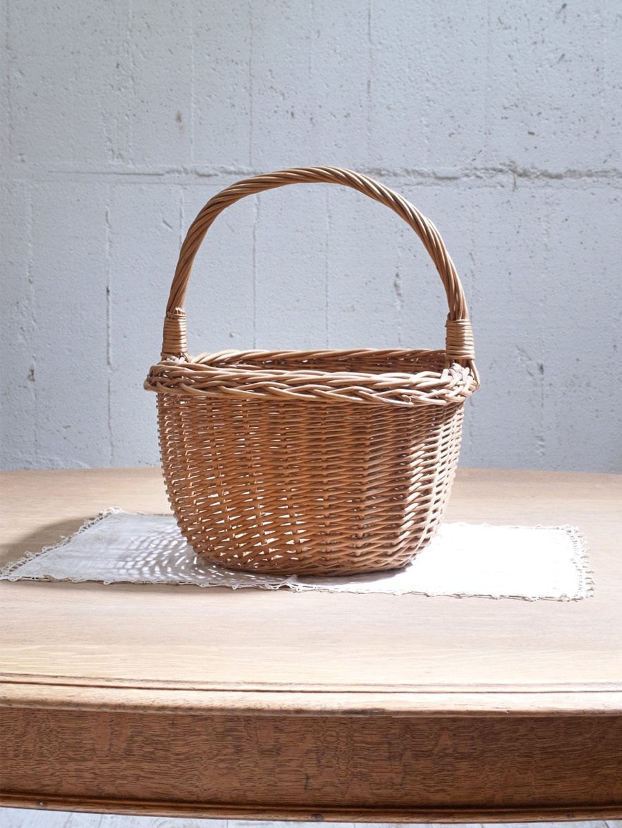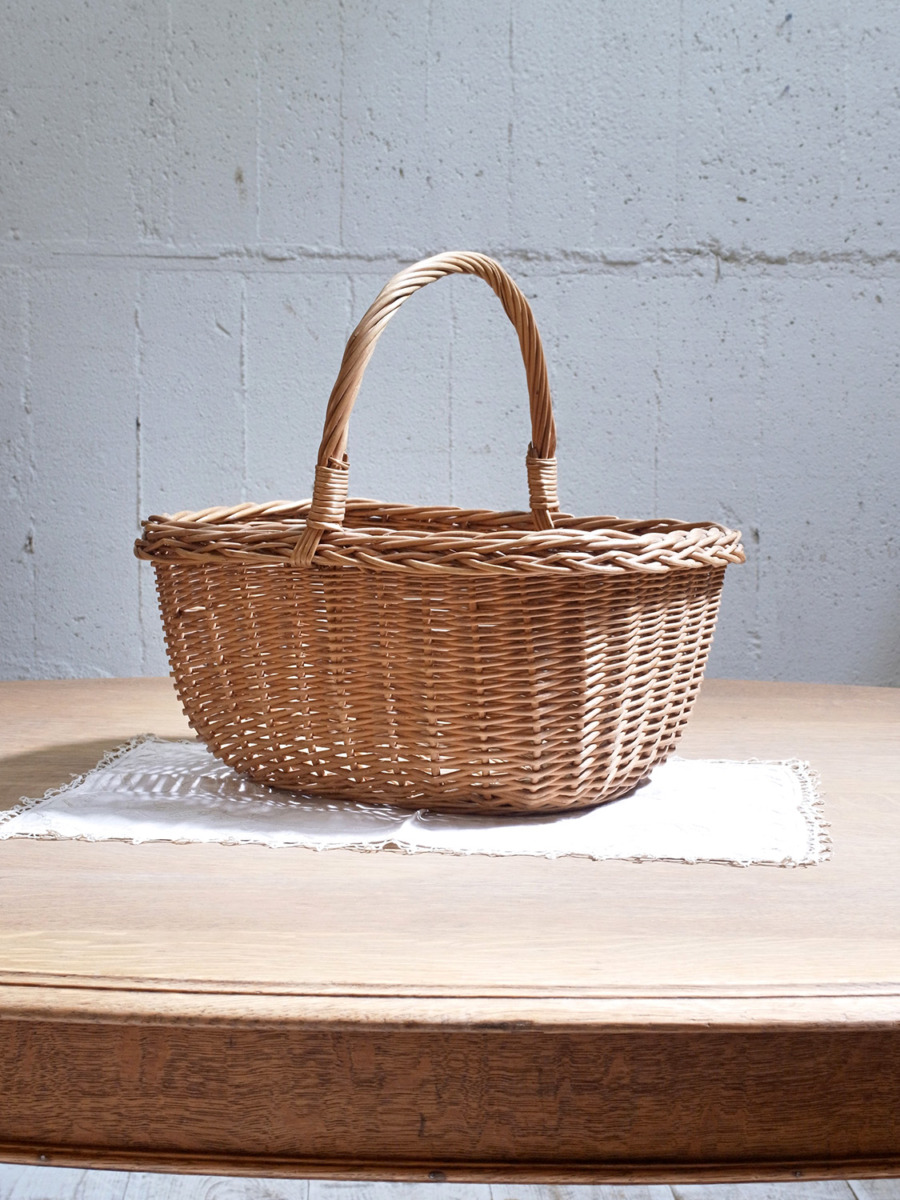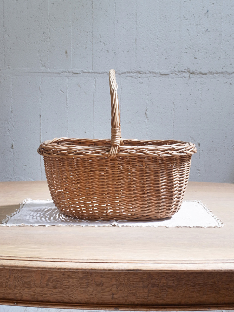 イギリス製のアンティークバスケットは、ちょうど良いサイズ感で、小物の収納に最適です。雑誌や新聞などの収納はもちろん、スリッパやスカーフなどのファッション小物の収納にもおすすめです。取っ手があり、持ち運びができます。とっても軽く、持ち運びしやすいです。編み目はスタンダードなデザインです。その他バスケット一覧はこちらから。