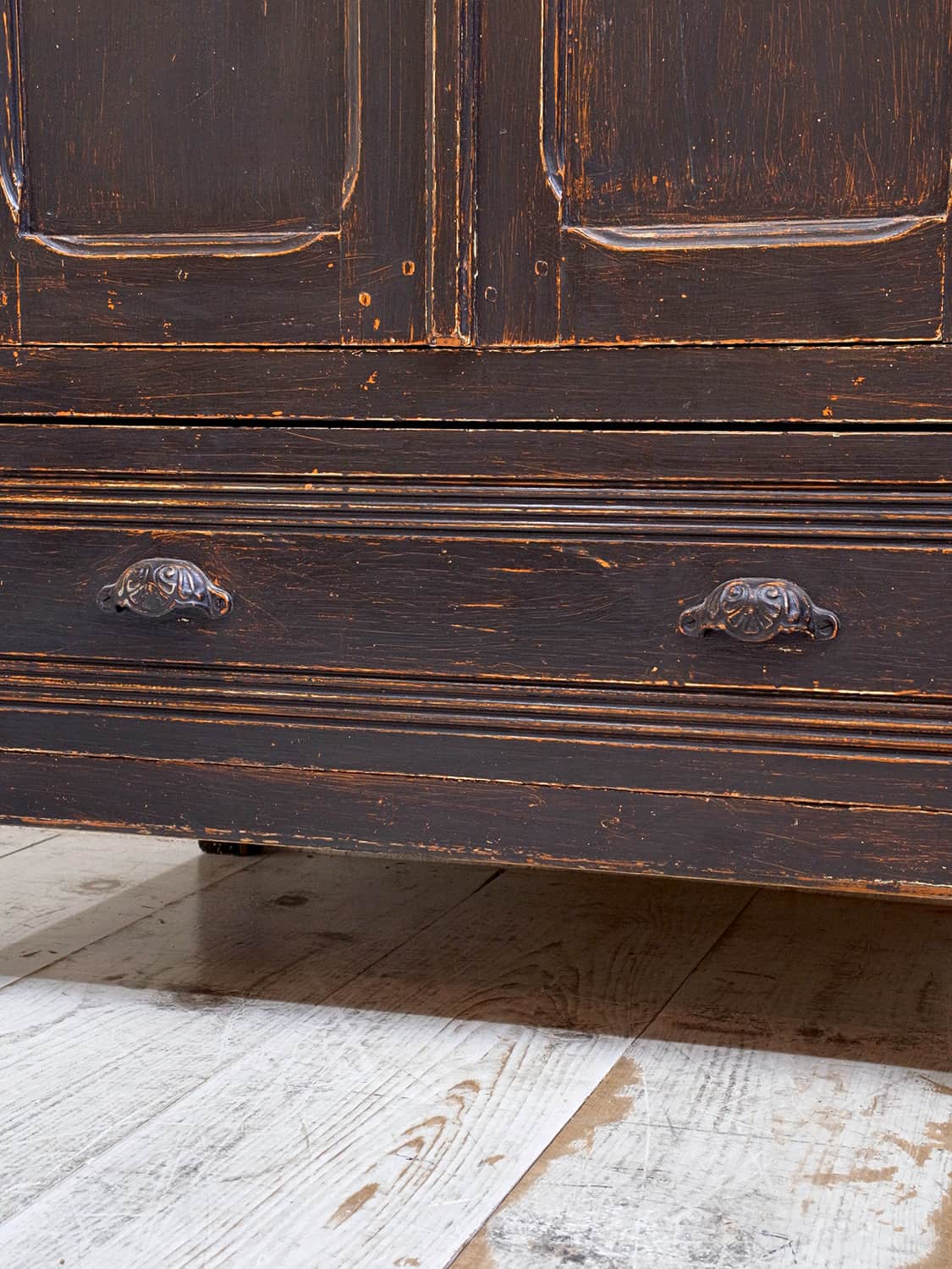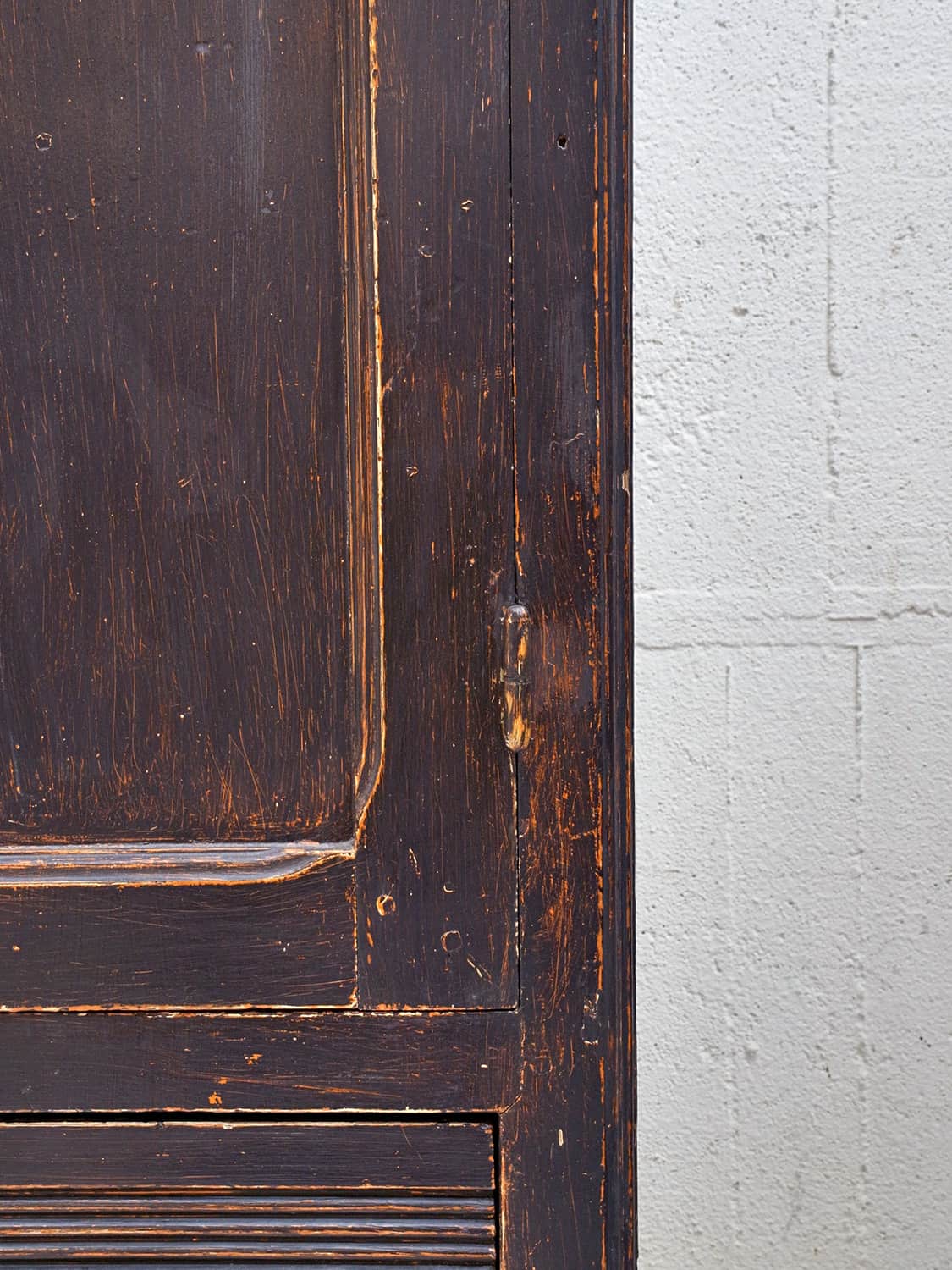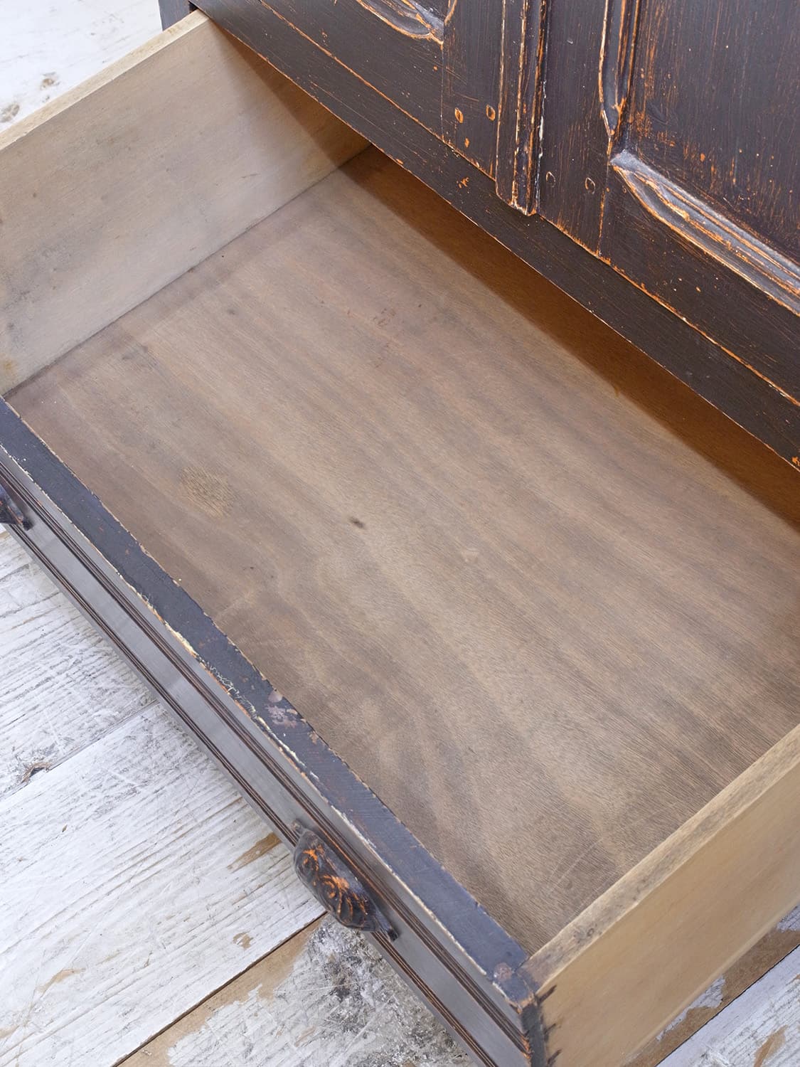 推定1930年代、フランス製のアンティークパインペイントキャビネットです。表面はブラックペイントの下にオレンジカラーでペイントされており、所々オレンジカラーが見えて少し変わった表情の家具です。ブランケットやバスタオルなどの収納用や食器棚としてなど様々な用途でご使用いただけます。扉内寸 W780 D415 上からH366/H360/H372mm。その他ペイント家具に一覧はこちらから。