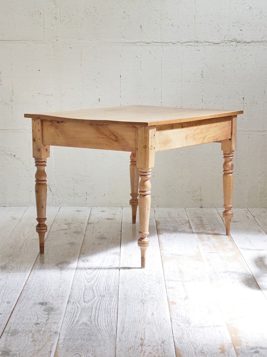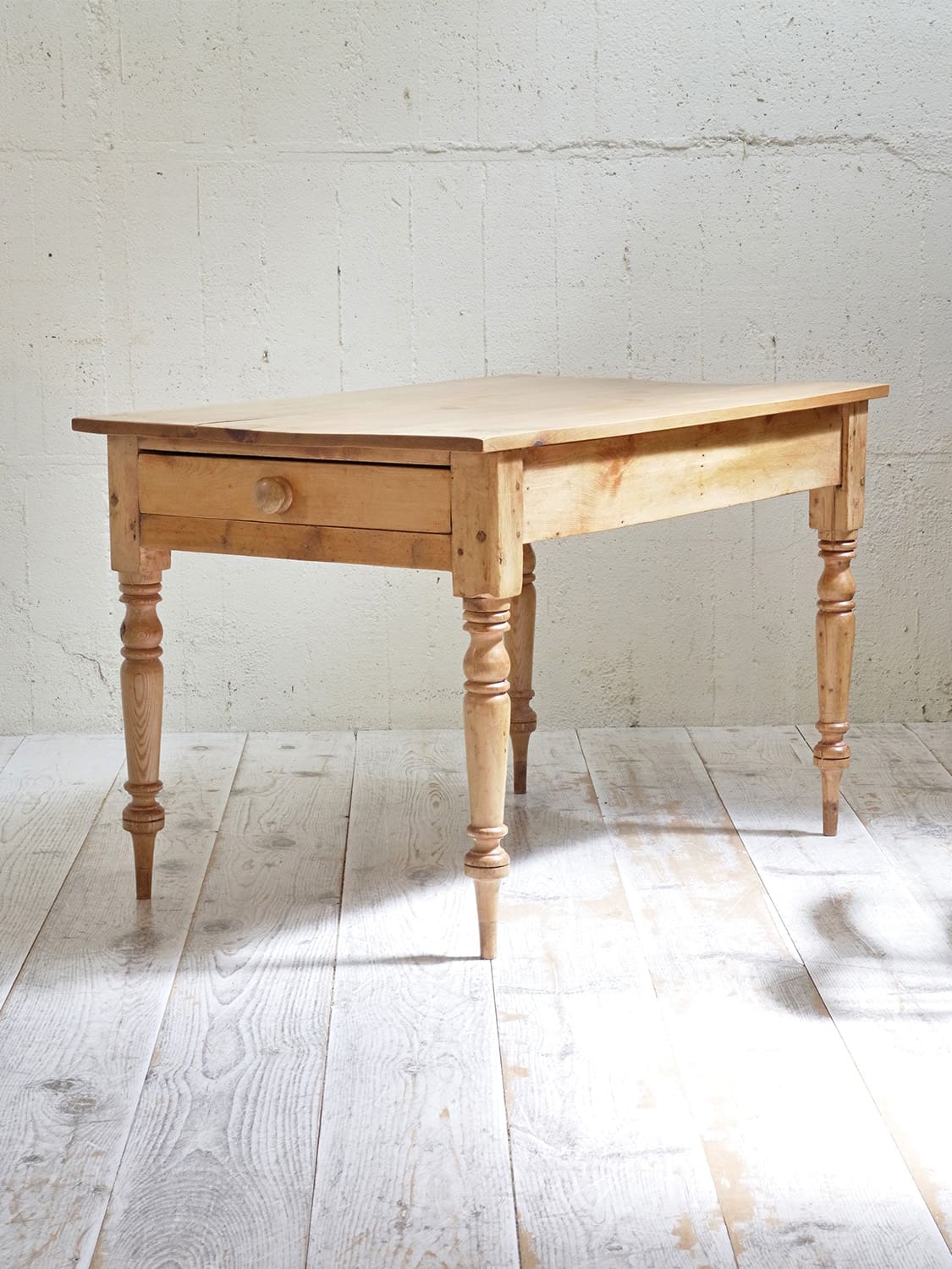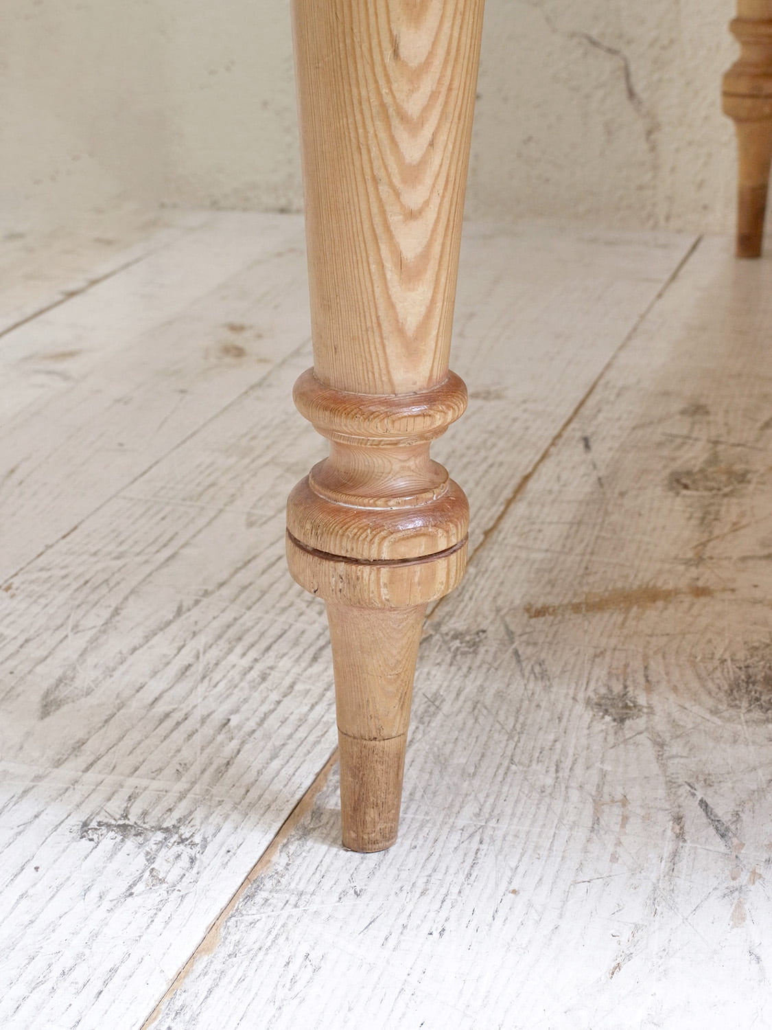 推定1920年代、イギリス製のアンティークパインテーブルです。イギリス王道のヴィクトリアンレッグが特徴的で、脚のデザインがとても美しいです。小ぶりながらお皿も問題なく置けるサイズ感で2人掛けのダイニングテーブルとしておすすめです。引き出しもカトラリーやランチョンマットなどの収納に最適です。引き出しサイズ W560 D450 H70mm。その他パインテーブルはこちらから。