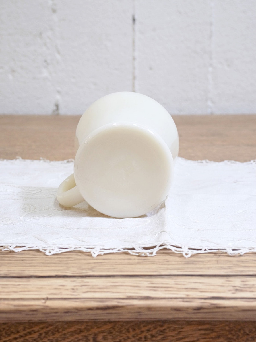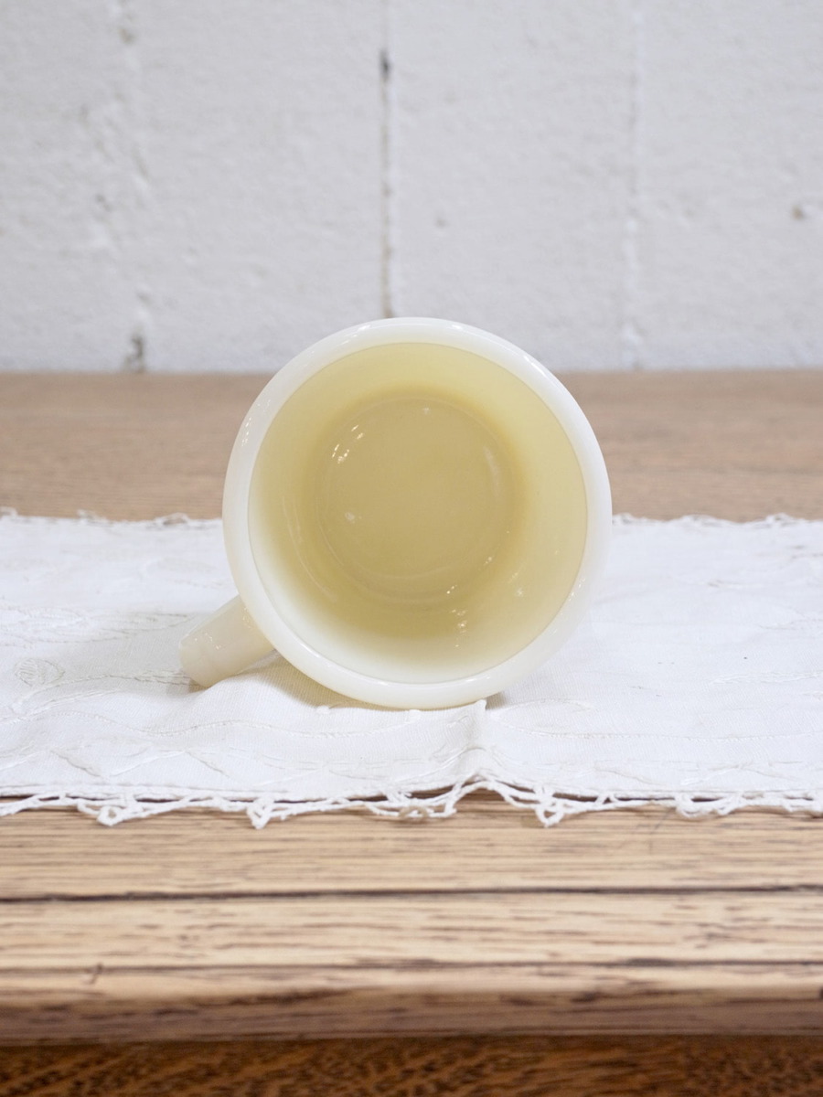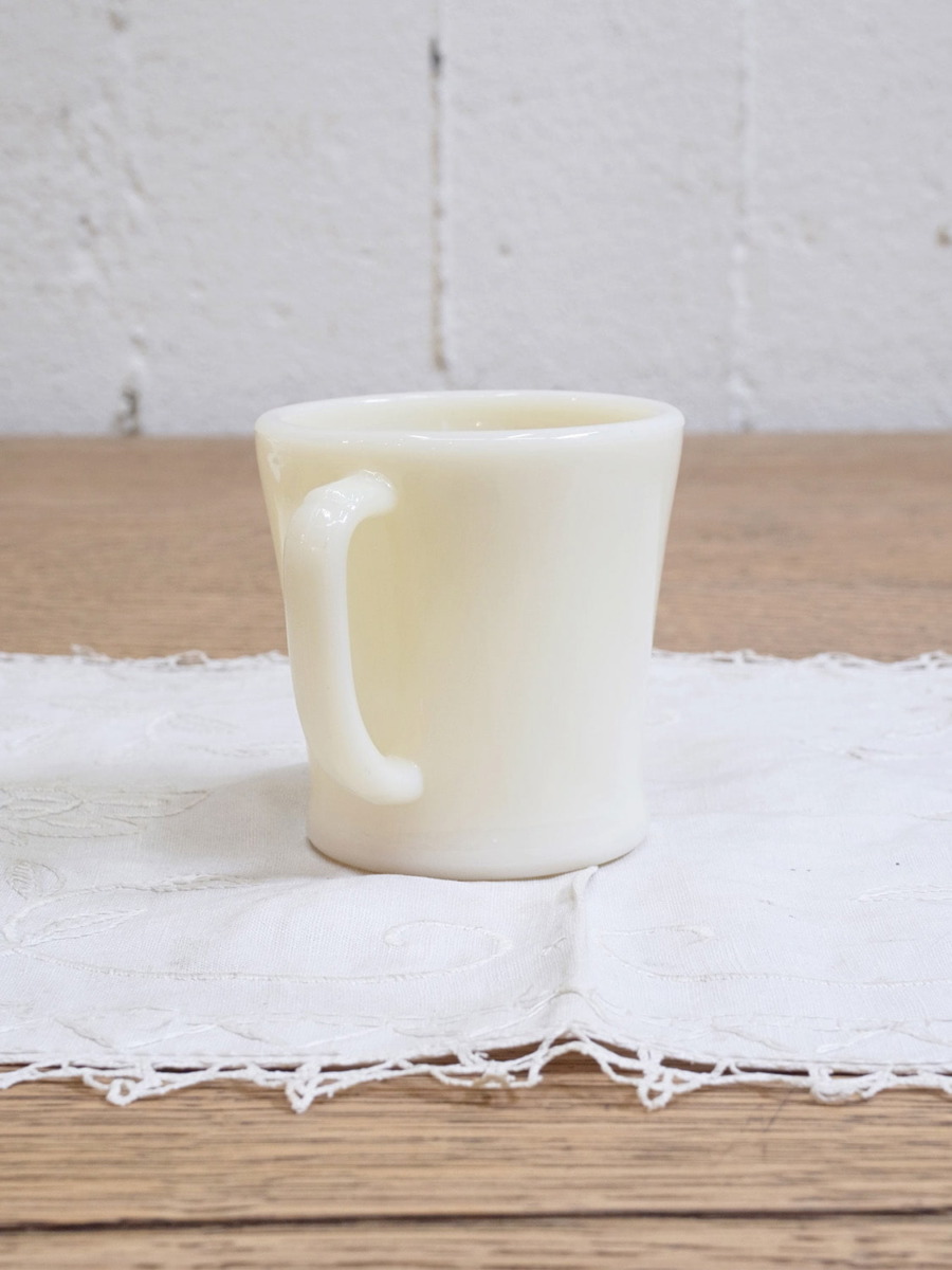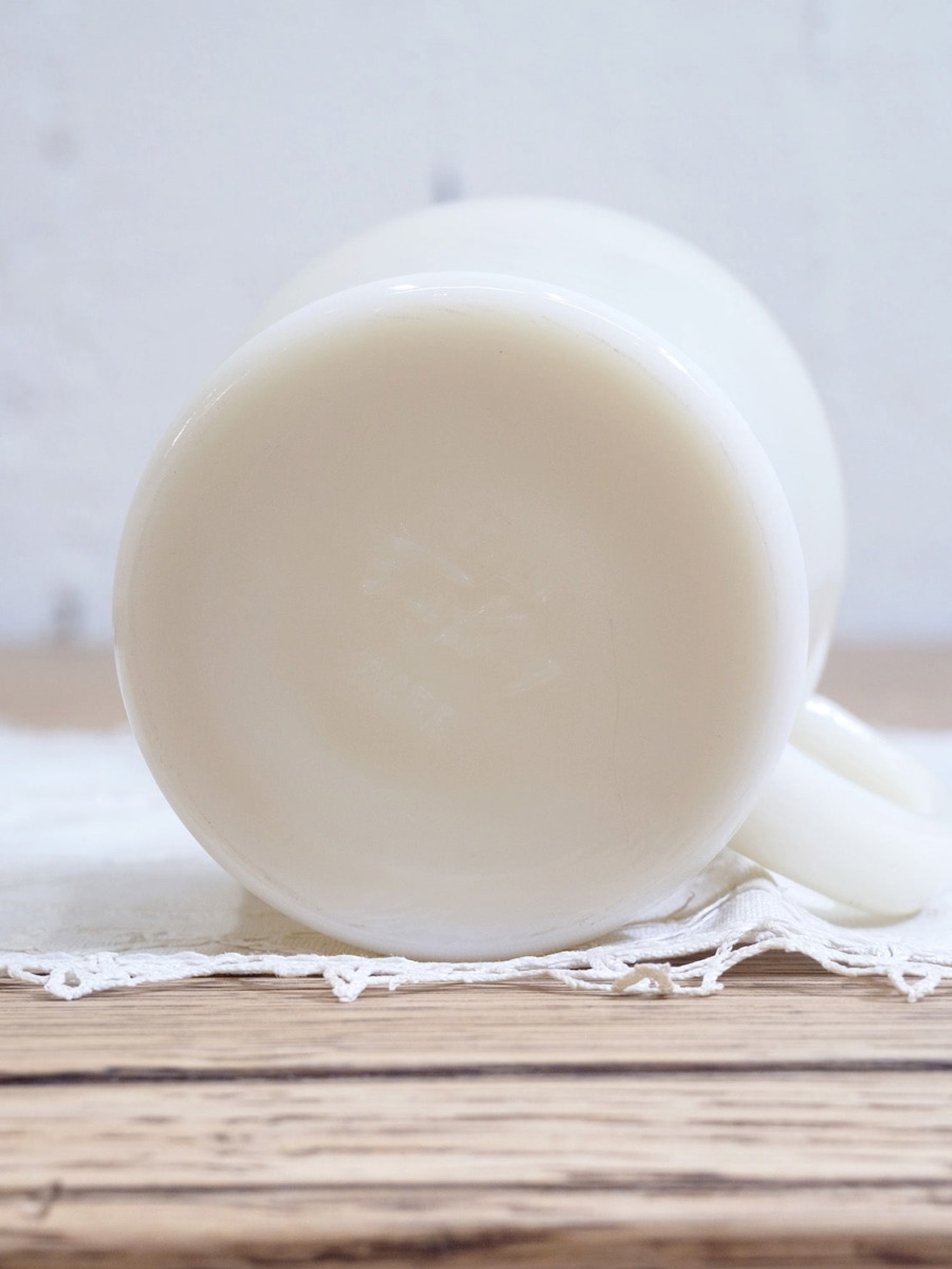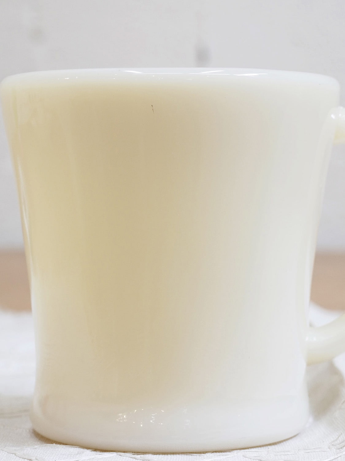 ファイヤーキングは、1941年に誕生したアメリカのアンカーホッキング社の耐熱ガラスブランドです。 1986年ミルクガラス製造終了していますが、今でも日本でも作られているアイテムです。こちらのマグは1950年代に作られたシェービングタイプでカラーはミルクホワイト(白)です。何とも言えない優しい雰囲気が食卓に映えます。
