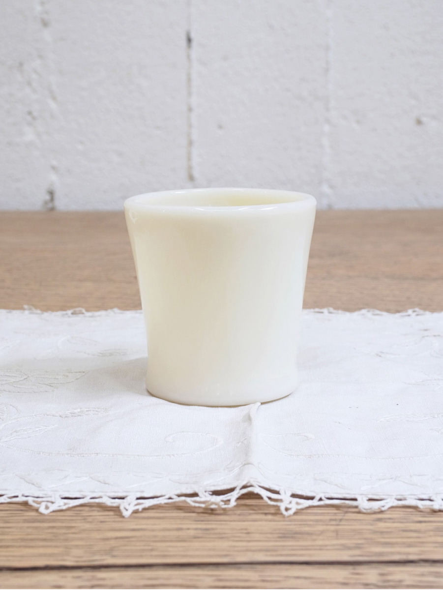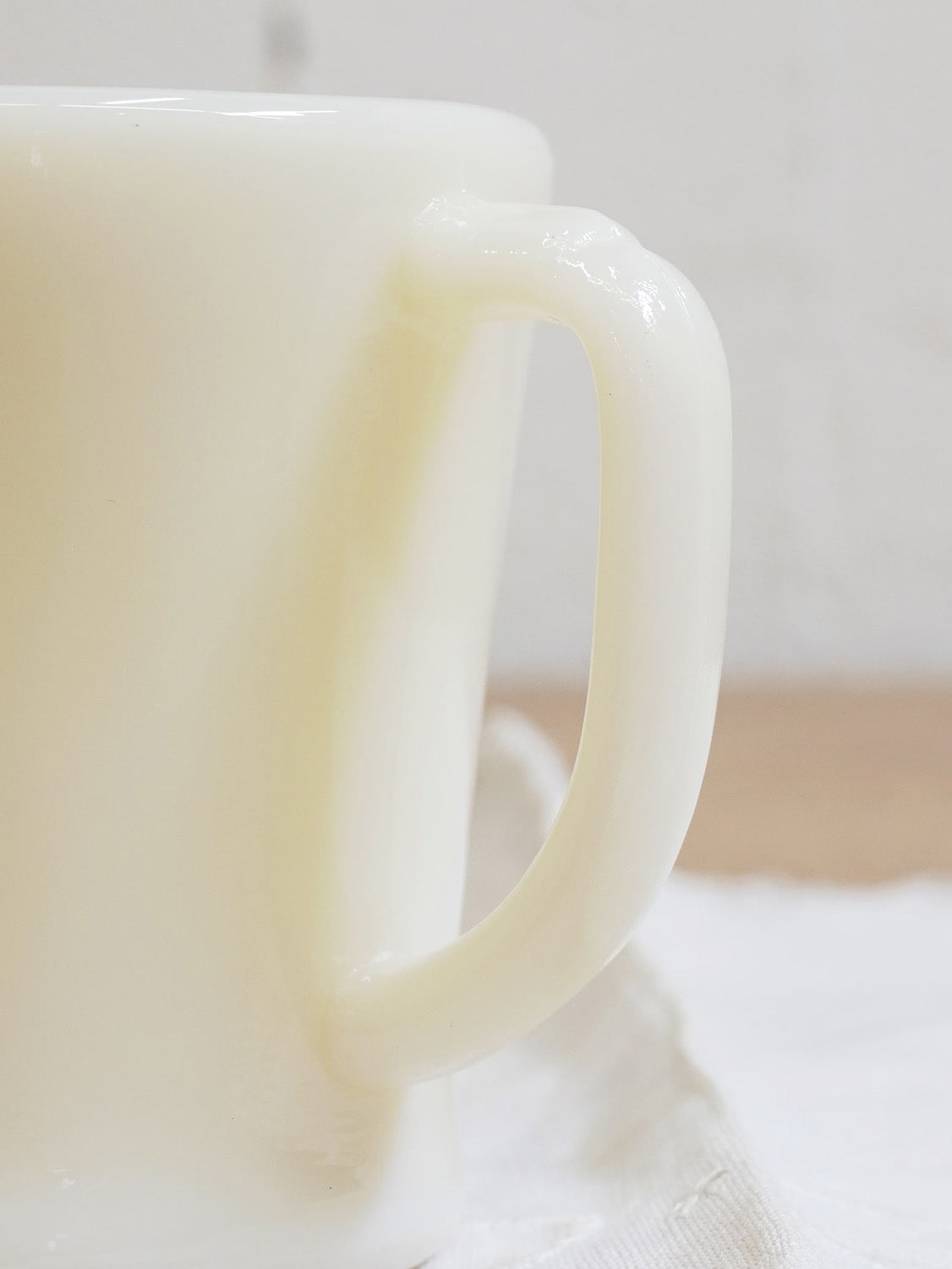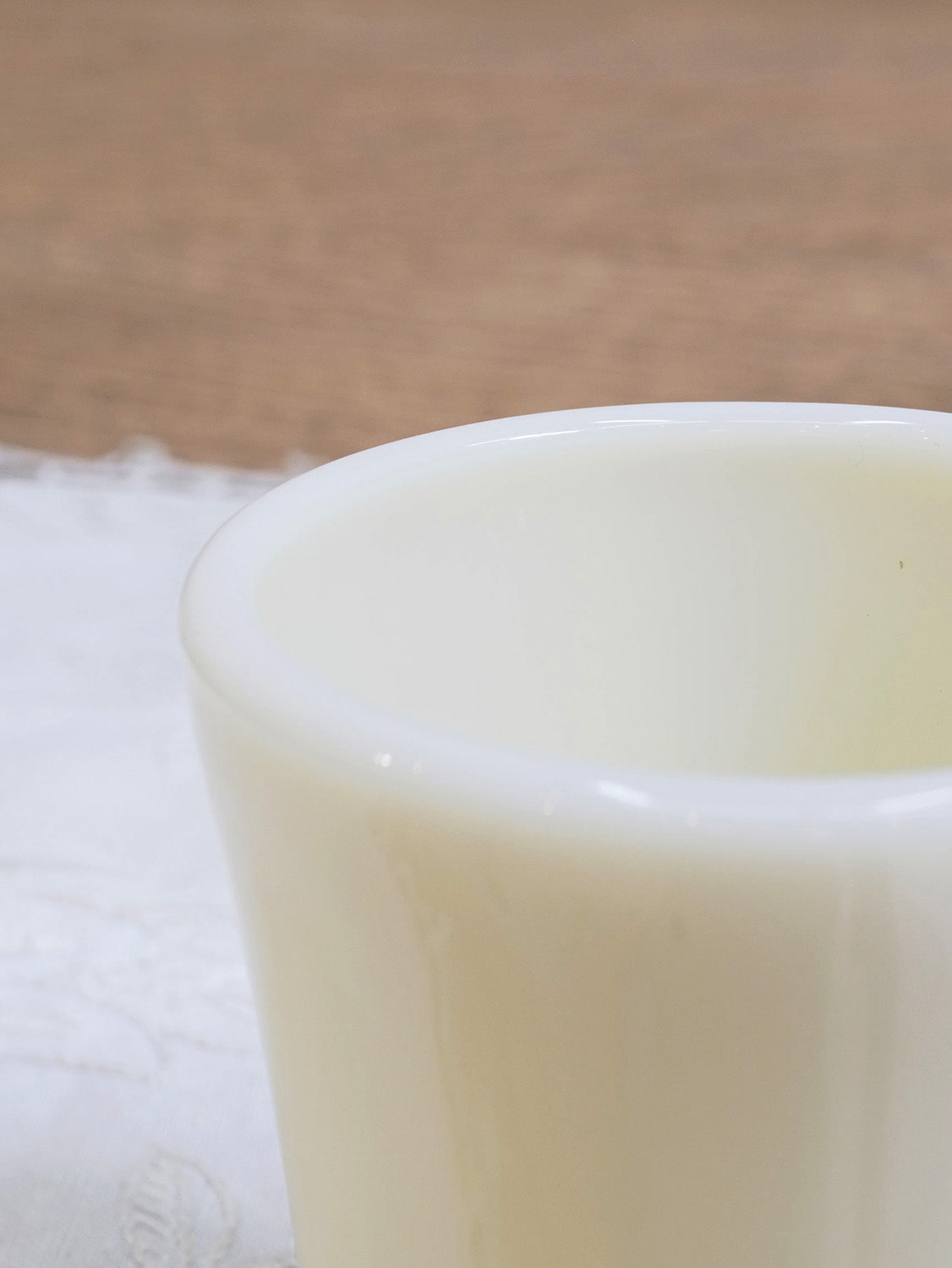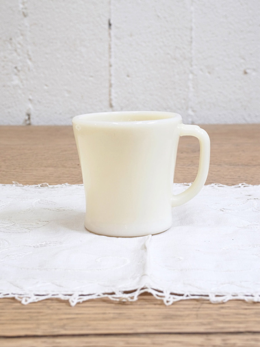 ファイヤーキングは、1941年に誕生したアメリカのアンカーホッキング社の耐熱ガラスブランドです。 1986年ミルクガラス製造終了していますが、今でも日本でも作られているアイテムです。こちらのマグは1950年代に作られたシェービングタイプでカラーはミルクホワイト(白)です。何とも言えない優しい雰囲気が食卓に映えます。
