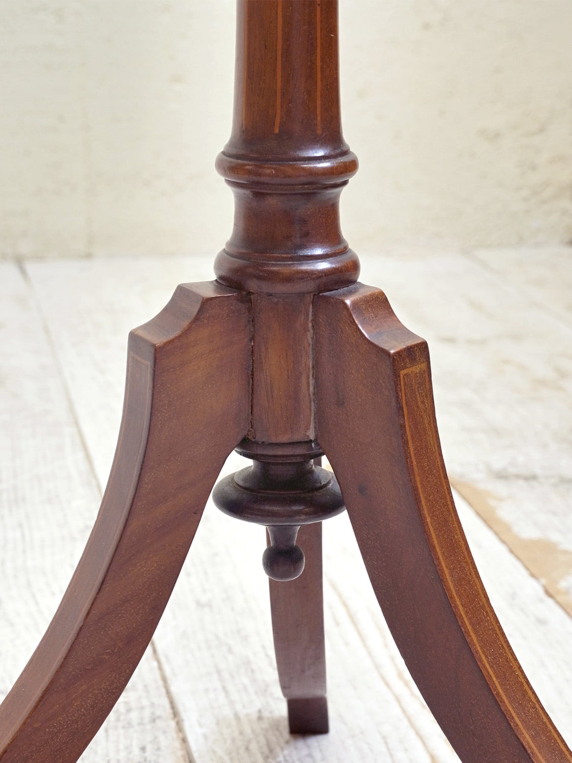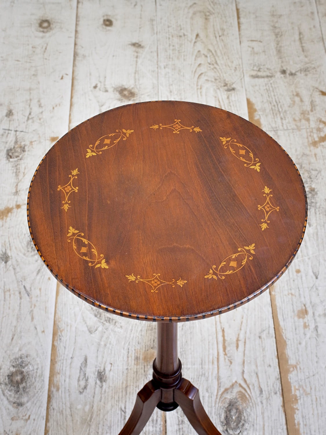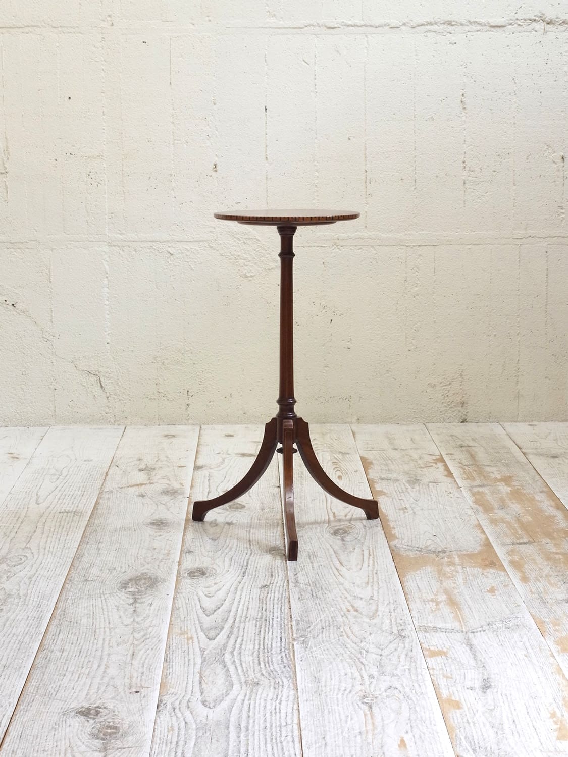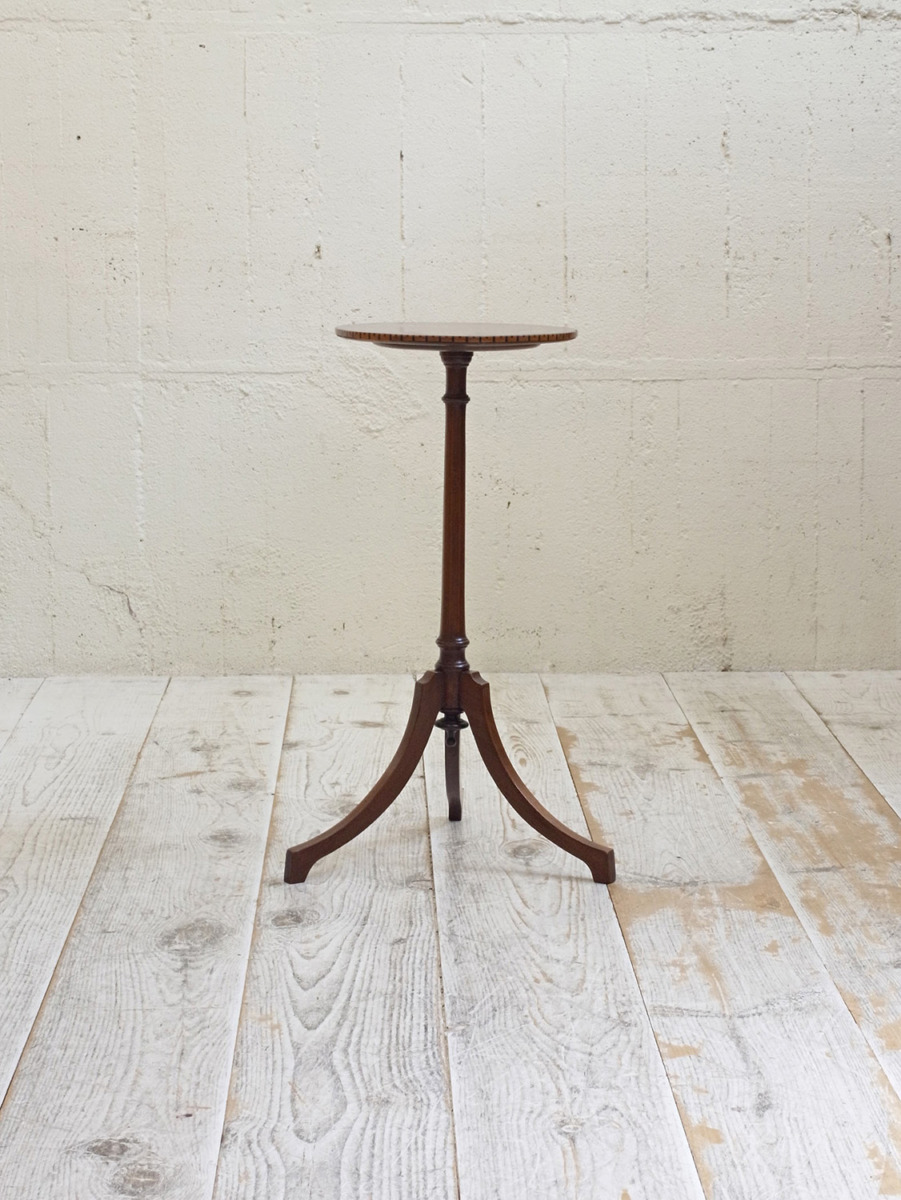 推定1930年代、イギリス製のマホガニーフラワースタンドです。3本脚(トライポッド)で繊細なシルエットですが安定感があり、インレイ(象嵌加工)が全体に施されていて上質な作りで状態も良好です。ワインテーブルと作りは一緒ですが高さがあり、装飾性が高いです。小ぶりで軽い家具なのでお部屋に取り入れやすく置くだけで華やかな印象となる家具です。天板の直径は31.5cmです。