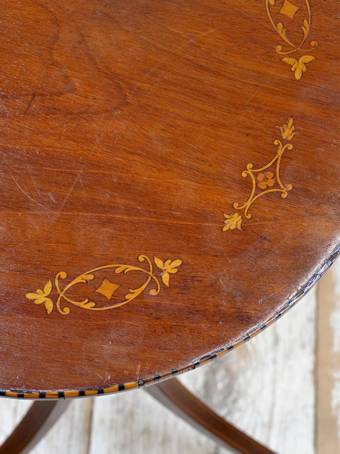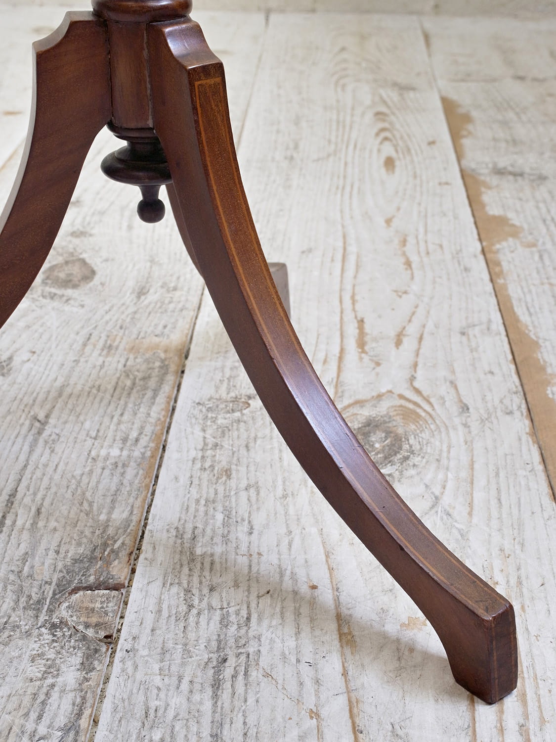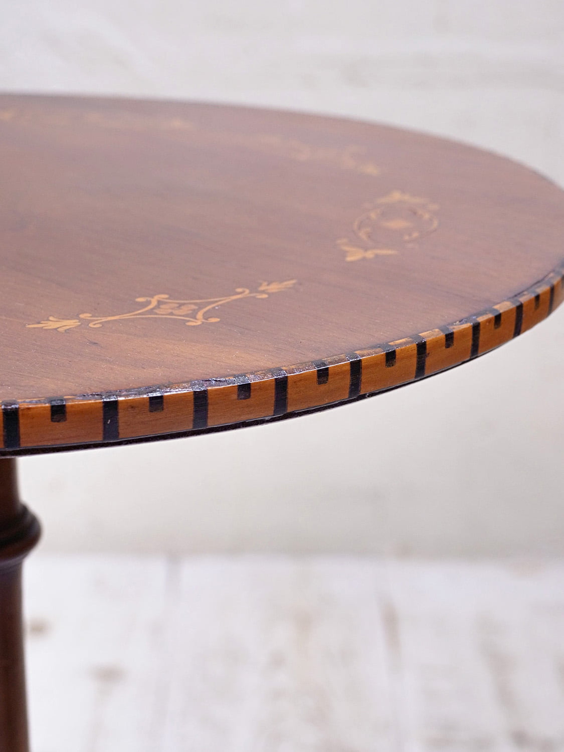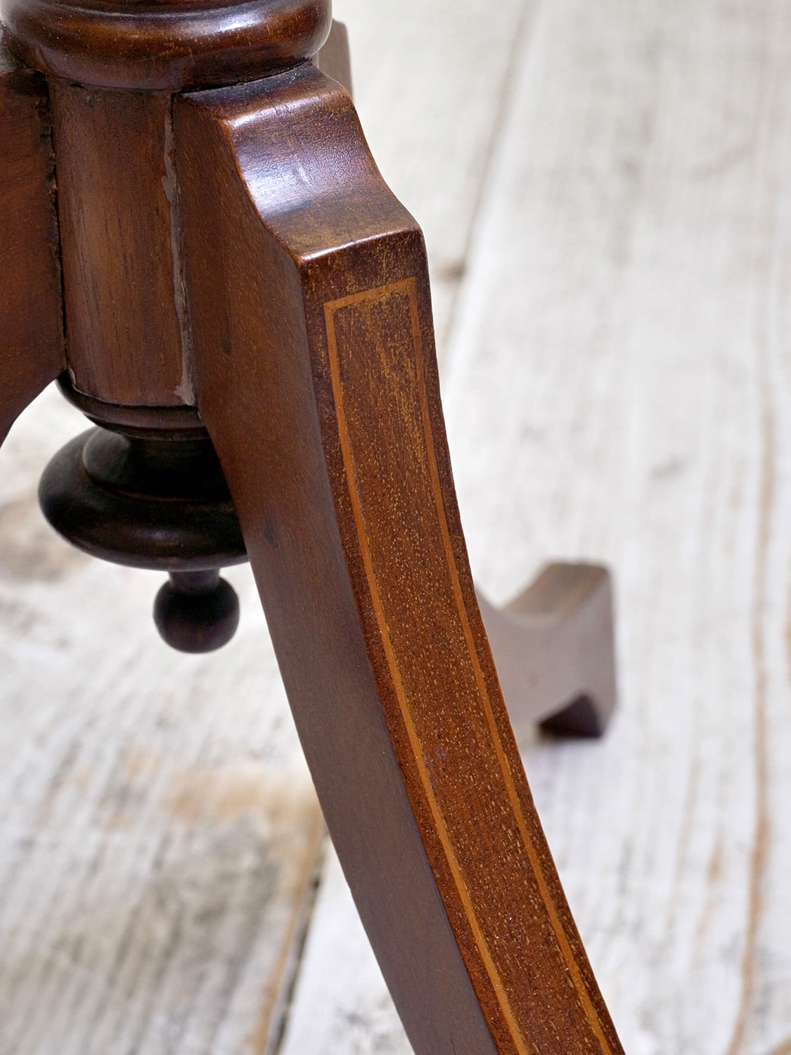 推定1930年代、イギリス製のマホガニーフラワースタンドです。3本脚(トライポッド)で繊細なシルエットですが安定感があり、インレイ(象嵌加工)が全体に施されていて上質な作りで状態も良好です。ワインテーブルと作りは一緒ですが高さがあり、装飾性が高いです。小ぶりで軽い家具なのでお部屋に取り入れやすく置くだけで華やかな印象となる家具です。天板の直径は31.5cmです。