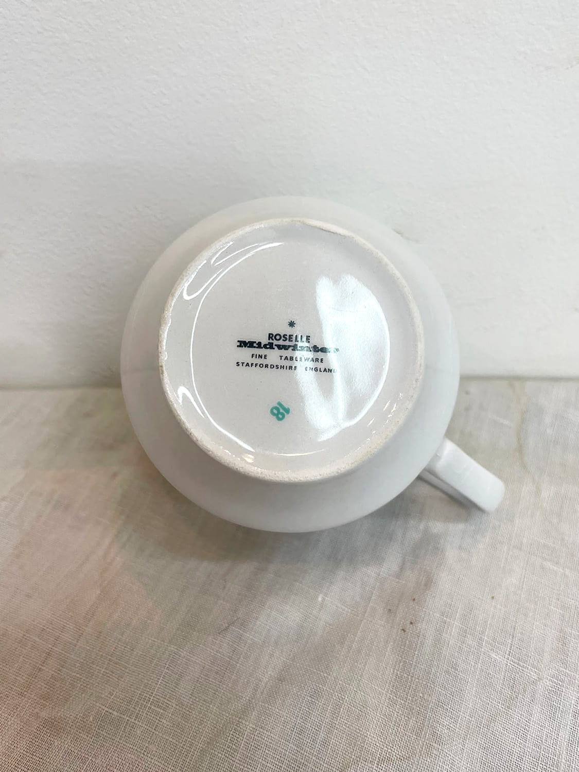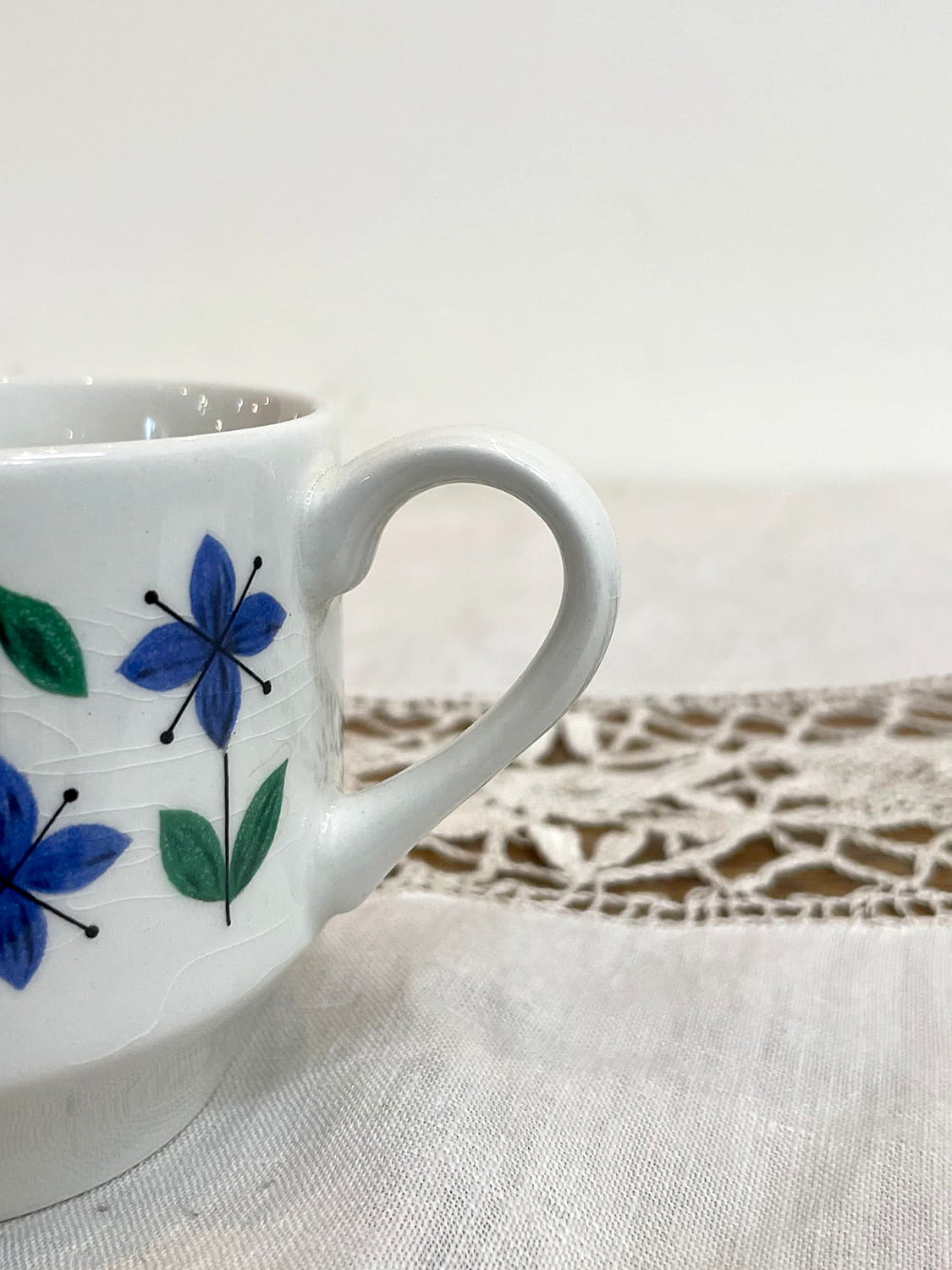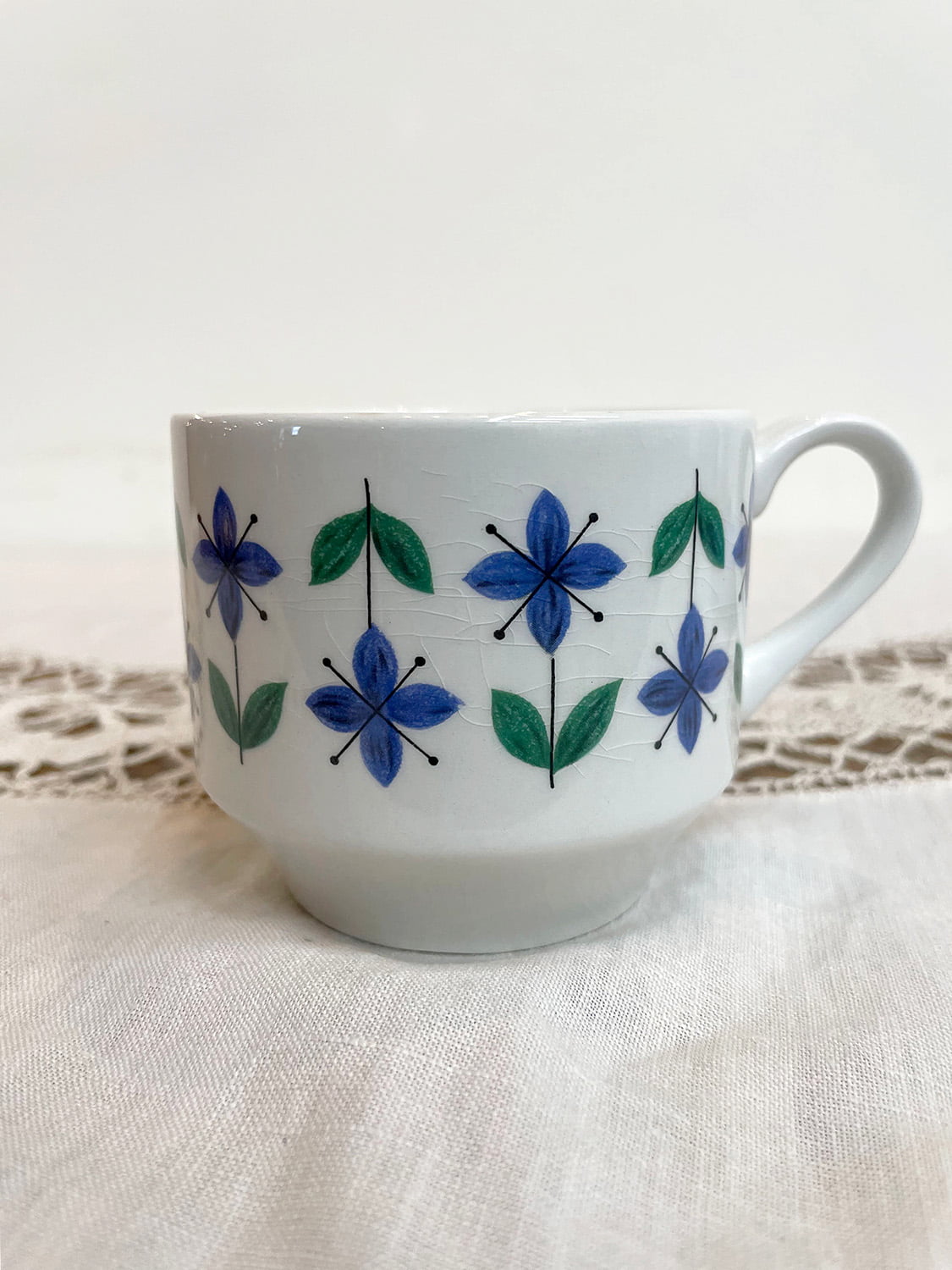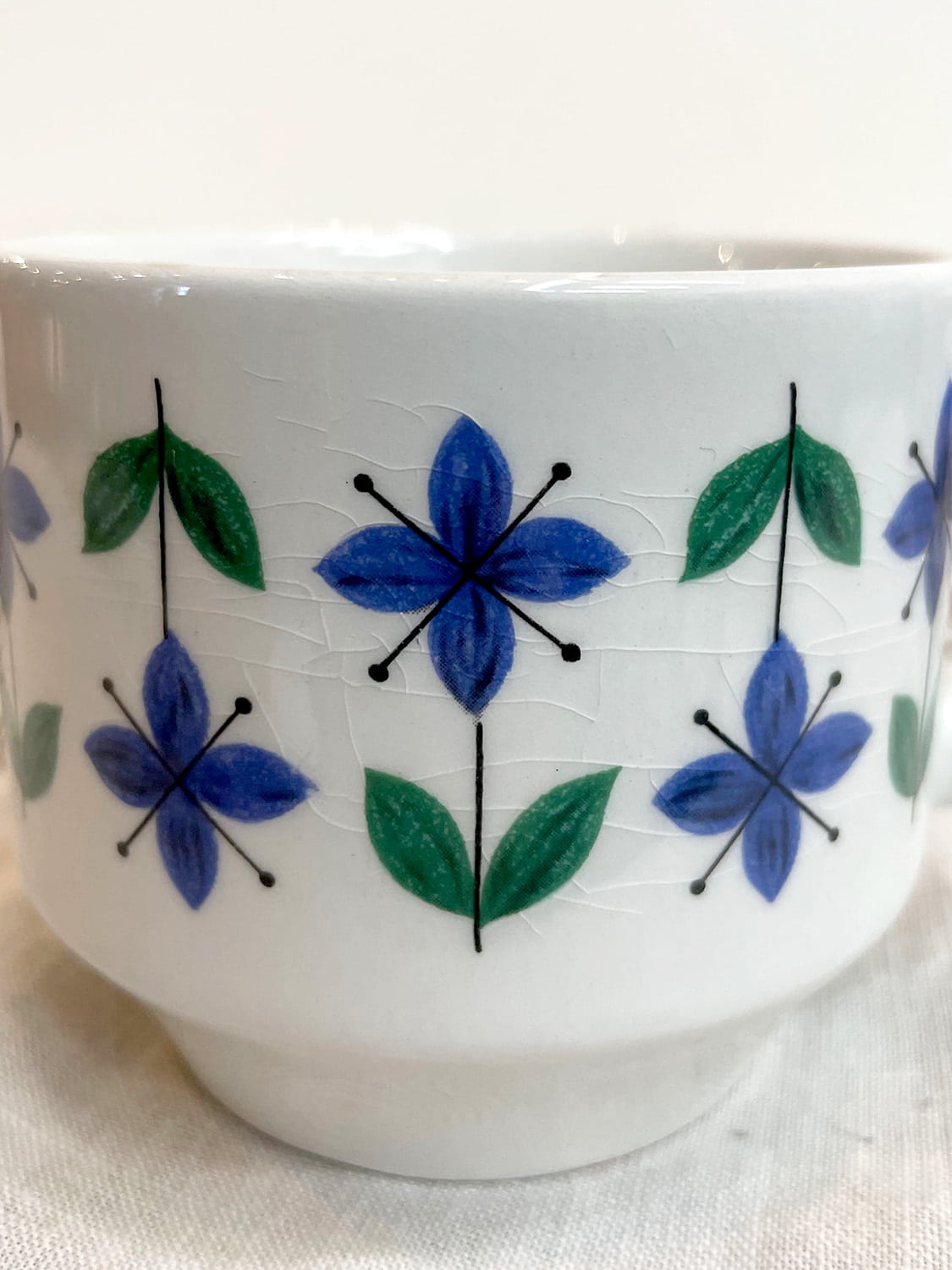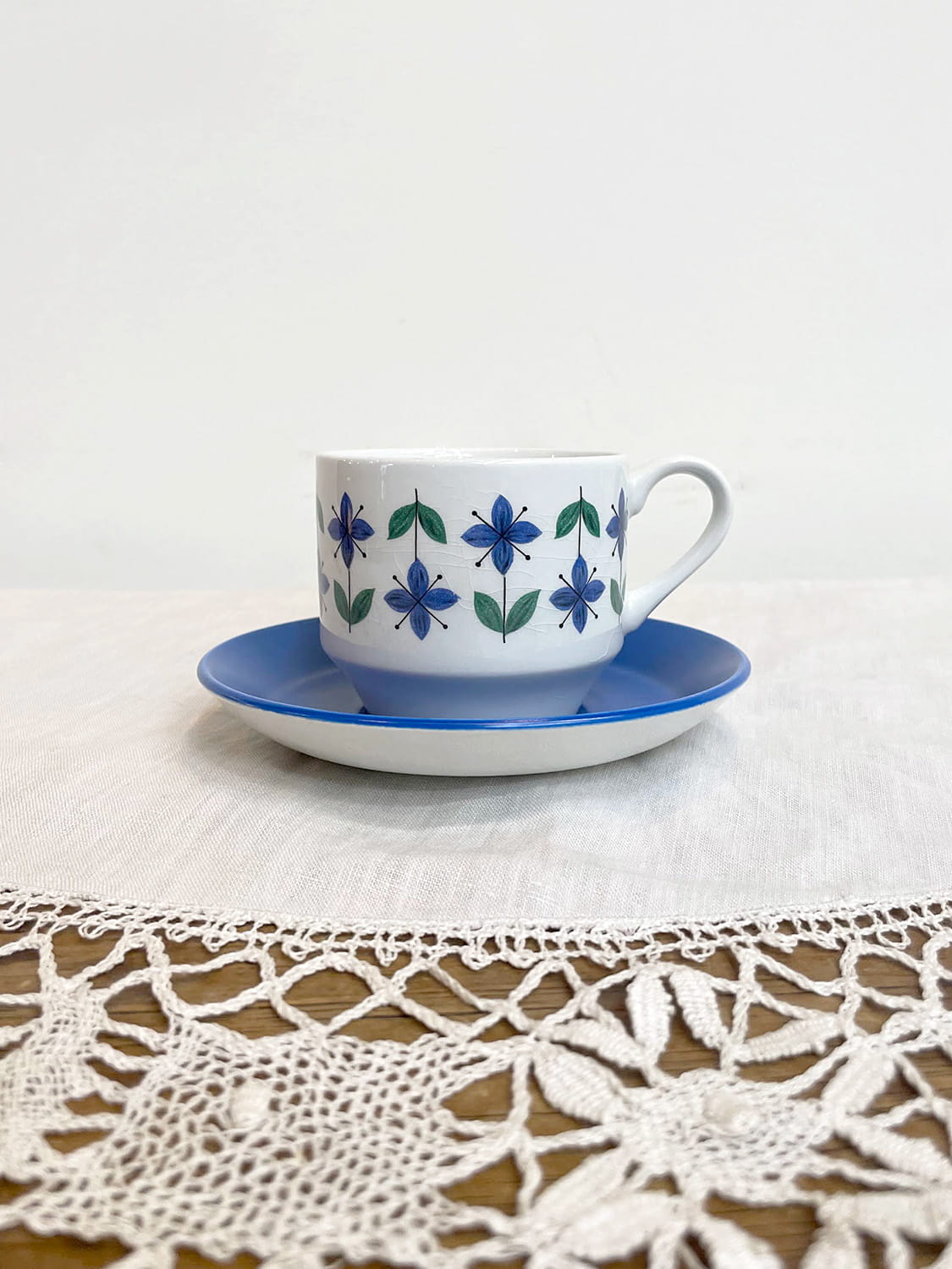 1910年、イギリスのストーク・オン・トレントで創業したMidwinter社のローゼル(Roselle)シリーズのカップアンドソーサーです。デザイナーのイヴ・ミッドウィンター(Eve Midwinter)によってデザインされた食器シリーズです。レトロな青い花柄がかわいいカップです。ソーサーは、マットなブルーに塗られています。デザートプレートと合わせてトリオでのご使用もおすすめです。塗られているのは表側のみで、裏側は白い一般的な陶磁器です。全体的に綺麗な状態ですが、細かな傷や汚れ等ある場合がありますので、ヴィンテージ品とご理解頂いた上でご購入をお願いいたします。その他ミッドウインター製品はこちらから。