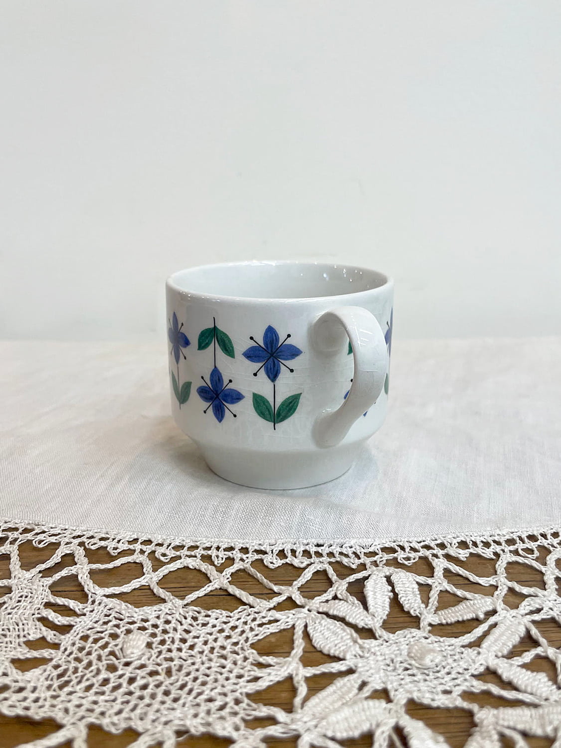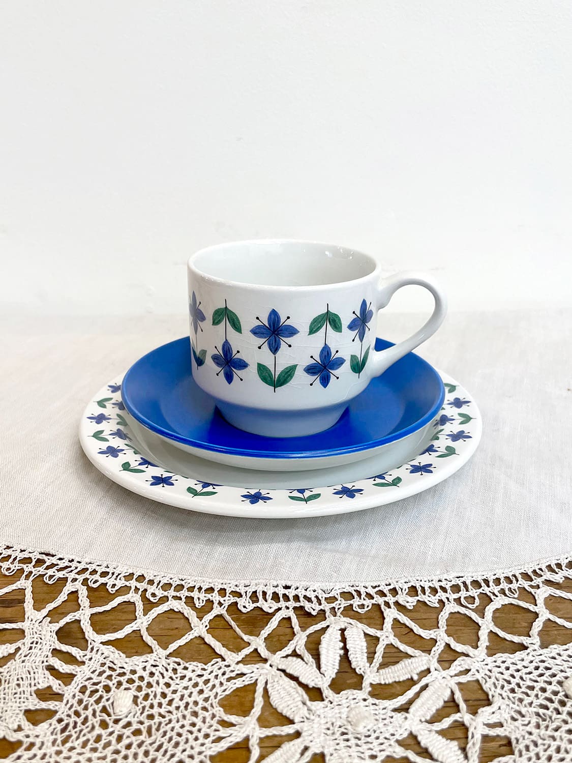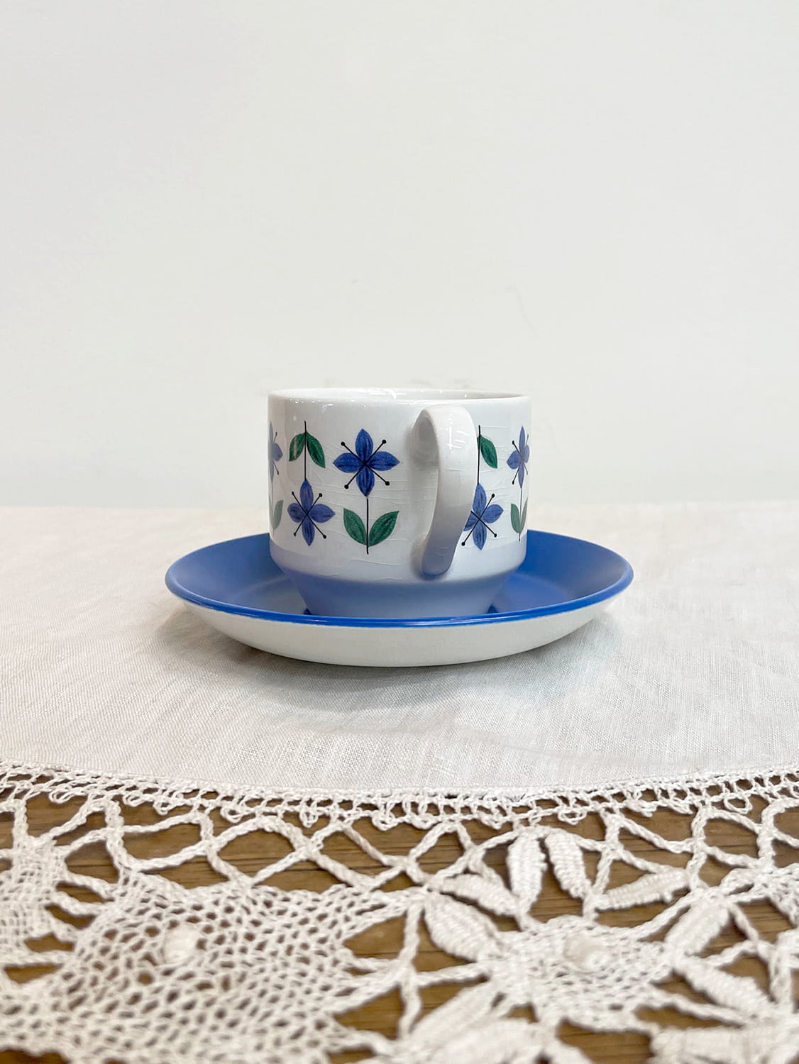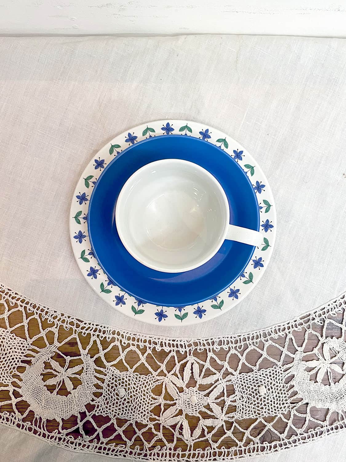 1910年、イギリスのストーク・オン・トレントで創業したMidwinter社のローゼル(Roselle)シリーズのカップアンドソーサーです。デザイナーのイヴ・ミッドウィンター(Eve Midwinter)によってデザインされた食器シリーズです。レトロな青い花柄がかわいいカップです。ソーサーは、マットなブルーに塗られています。デザートプレートと合わせてトリオでのご使用もおすすめです。塗られているのは表側のみで、裏側は白い一般的な陶磁器です。全体的に綺麗な状態ですが、細かな傷や汚れ等ある場合がありますので、ヴィンテージ品とご理解頂いた上でご購入をお願いいたします。その他ミッドウインター製品はこちらから。