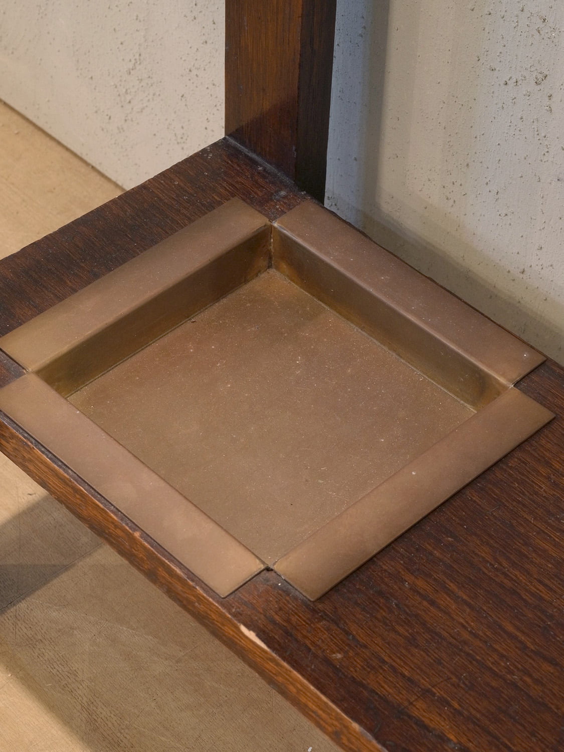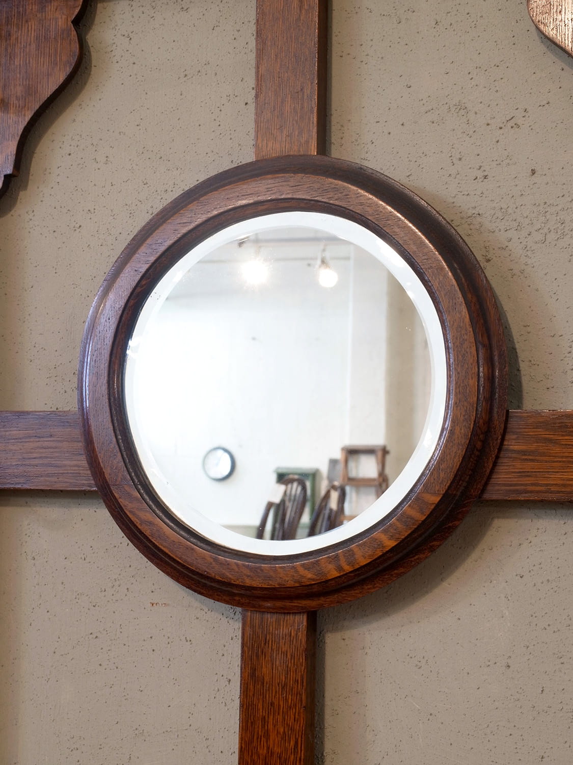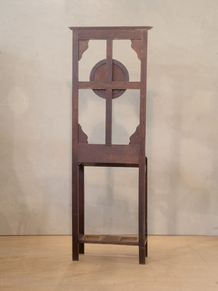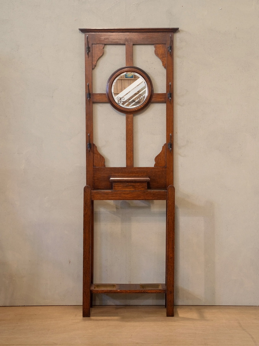 推定1930年代、イギリス製アンティークオークホールスタンドです。ミラーサイズ W320 H320mm。コンパクトなホールスタンドは日本の住まいにも置きやすくお薦めです。フックには帽子や鍵を、スタンド部分には傘などをいれることができます。受け皿は取り外すことができるので雨に濡れた傘を入れても大丈夫です。ちょうど良い箱型の収納があり、鍵や印鑑など細々したものを収納しておくことができます。