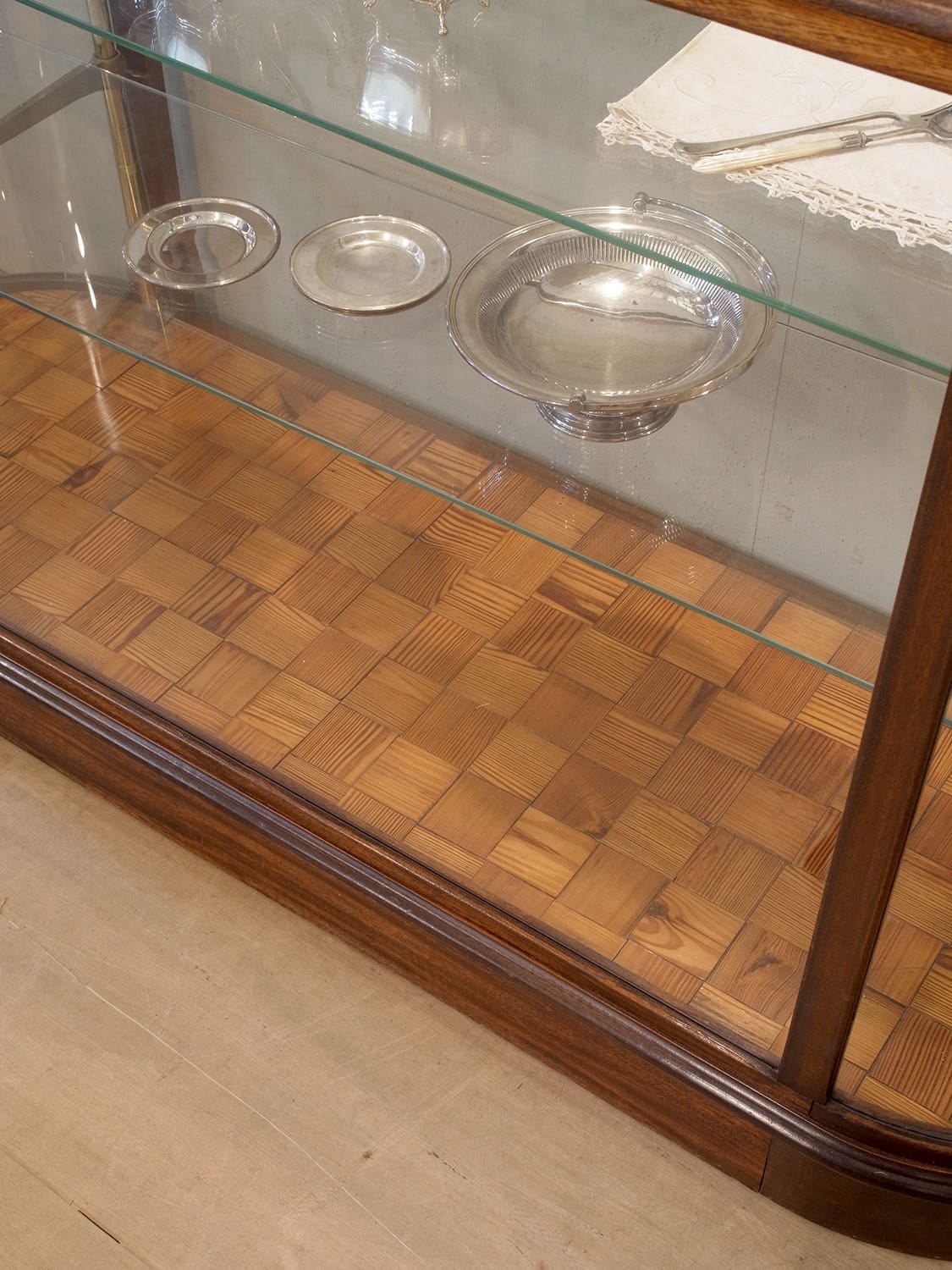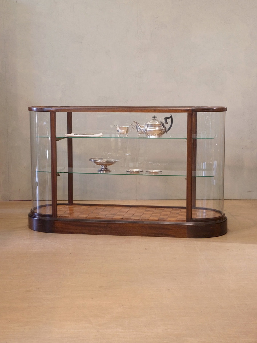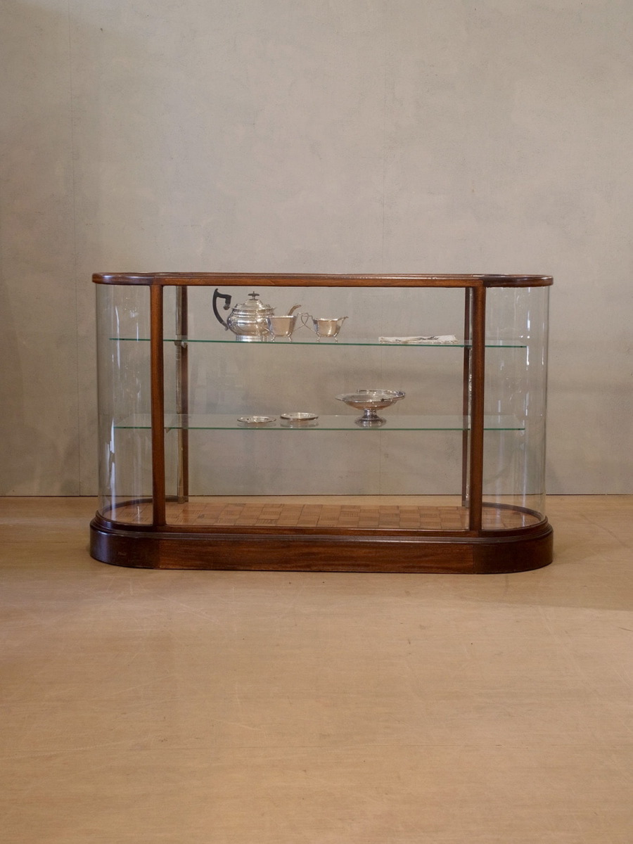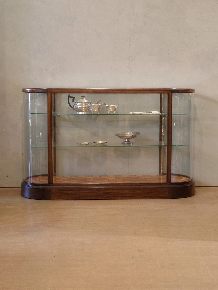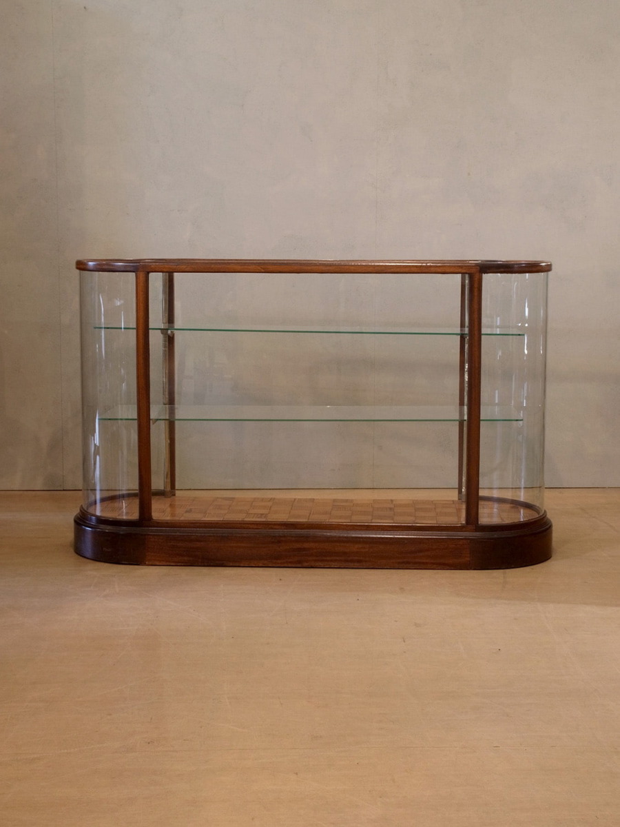 推定1930年代、イギリス製のアンティークカウンターショーケースです。棚板もガラス板なので開放感があり、光を透すためディスプレイされたものが映えます。棚板は可動式です。陶器のお皿やお洋服など店舗什器としてのご使用がおすすめです。底板は互い違いの木目の板を市松模様のように配置されていてとてもおしゃれです。左右がラウンドした作りで置くだけで映える家具です。背面は扉などなくオープンです。棚板サイズ W1300 D300 t5mm。撮影時の棚高さ H195/H260/H308mm。その他ショーケースはこちらから。