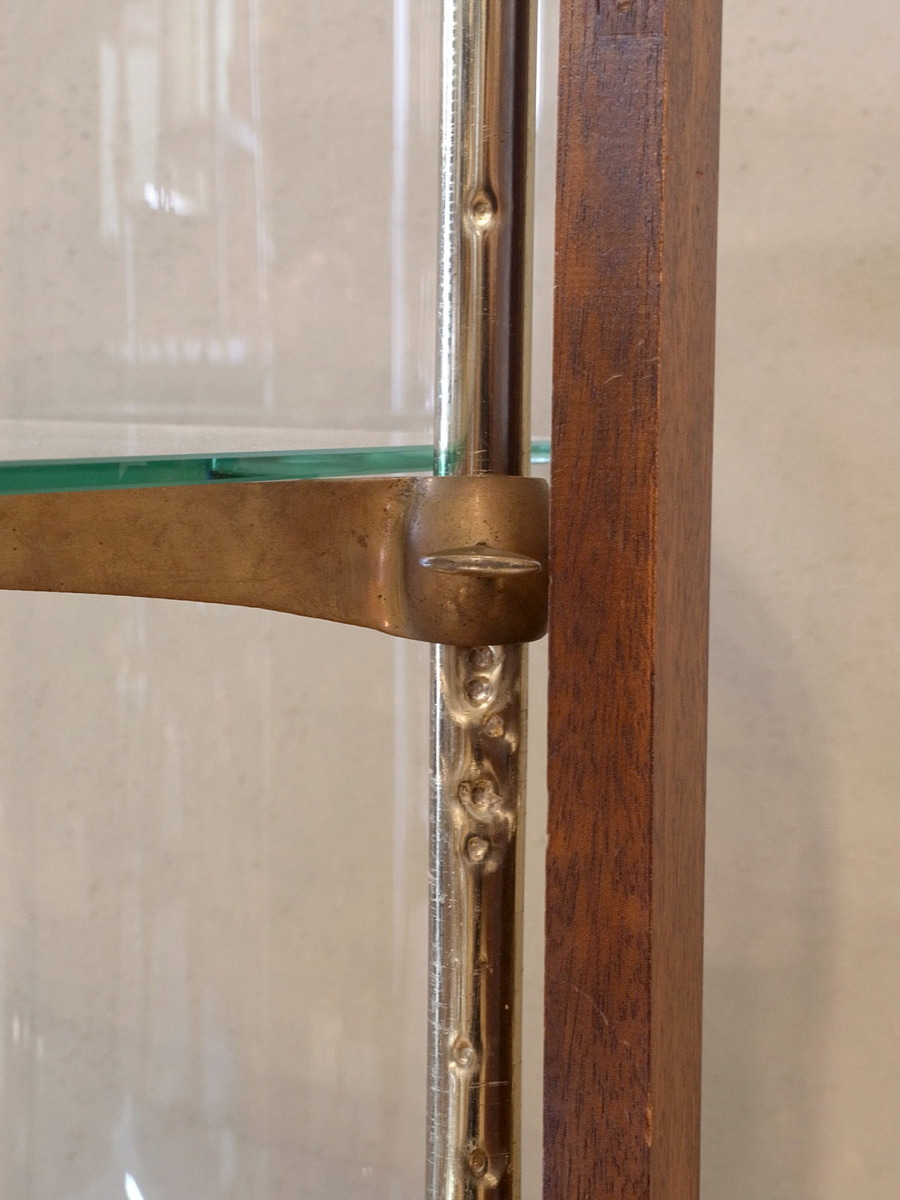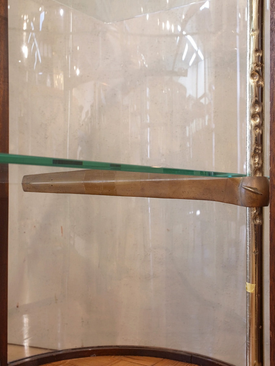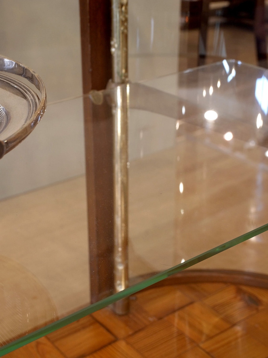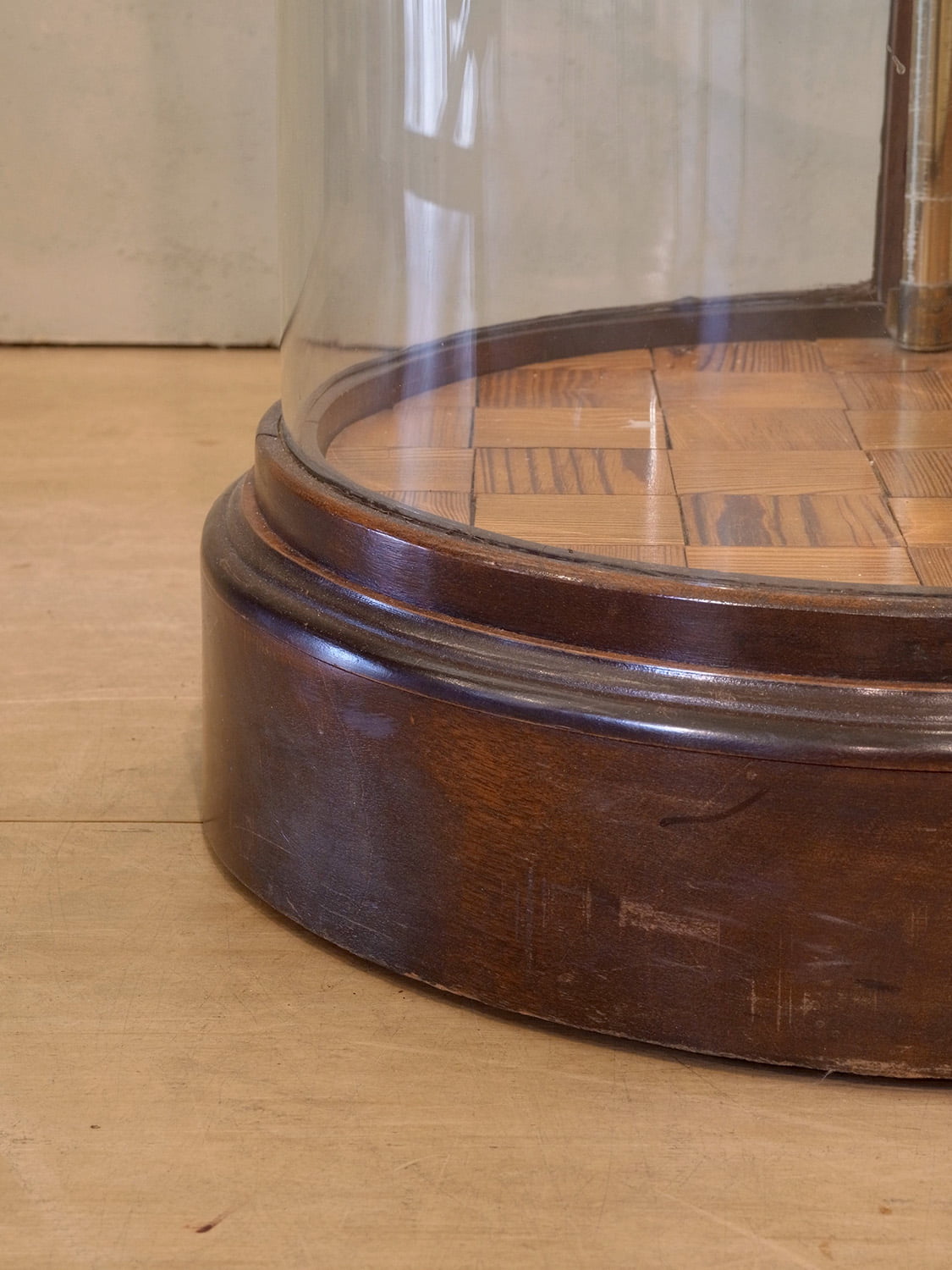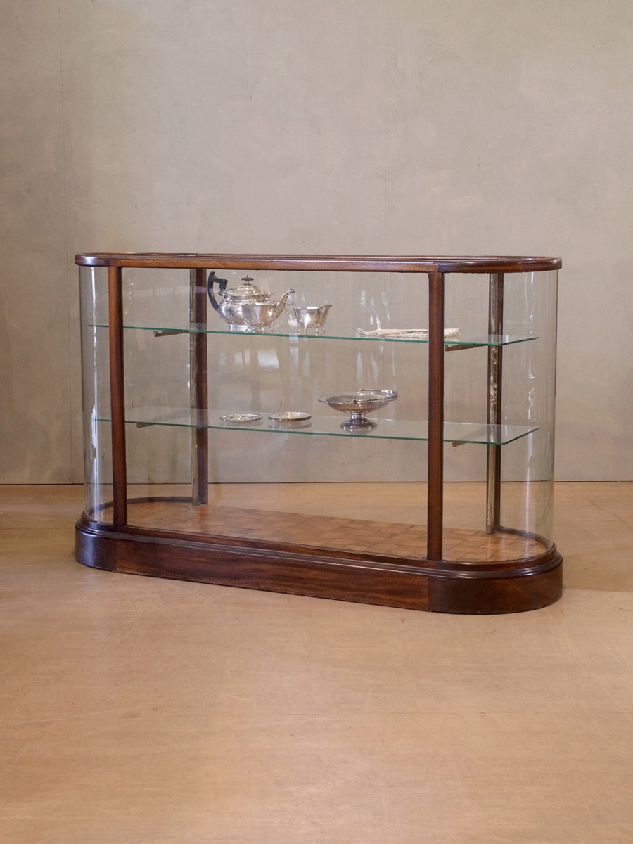 推定1930年代、イギリス製のアンティークカウンターショーケースです。棚板もガラス板なので開放感があり、光を透すためディスプレイされたものが映えます。棚板は可動式です。陶器のお皿やお洋服など店舗什器としてのご使用がおすすめです。底板は互い違いの木目の板を市松模様のように配置されていてとてもおしゃれです。左右がラウンドした作りで置くだけで映える家具です。背面は扉などなくオープンです。棚板サイズ W1300 D300 t5mm。撮影時の棚高さ H195/H260/H308mm。その他ショーケースはこちらから。