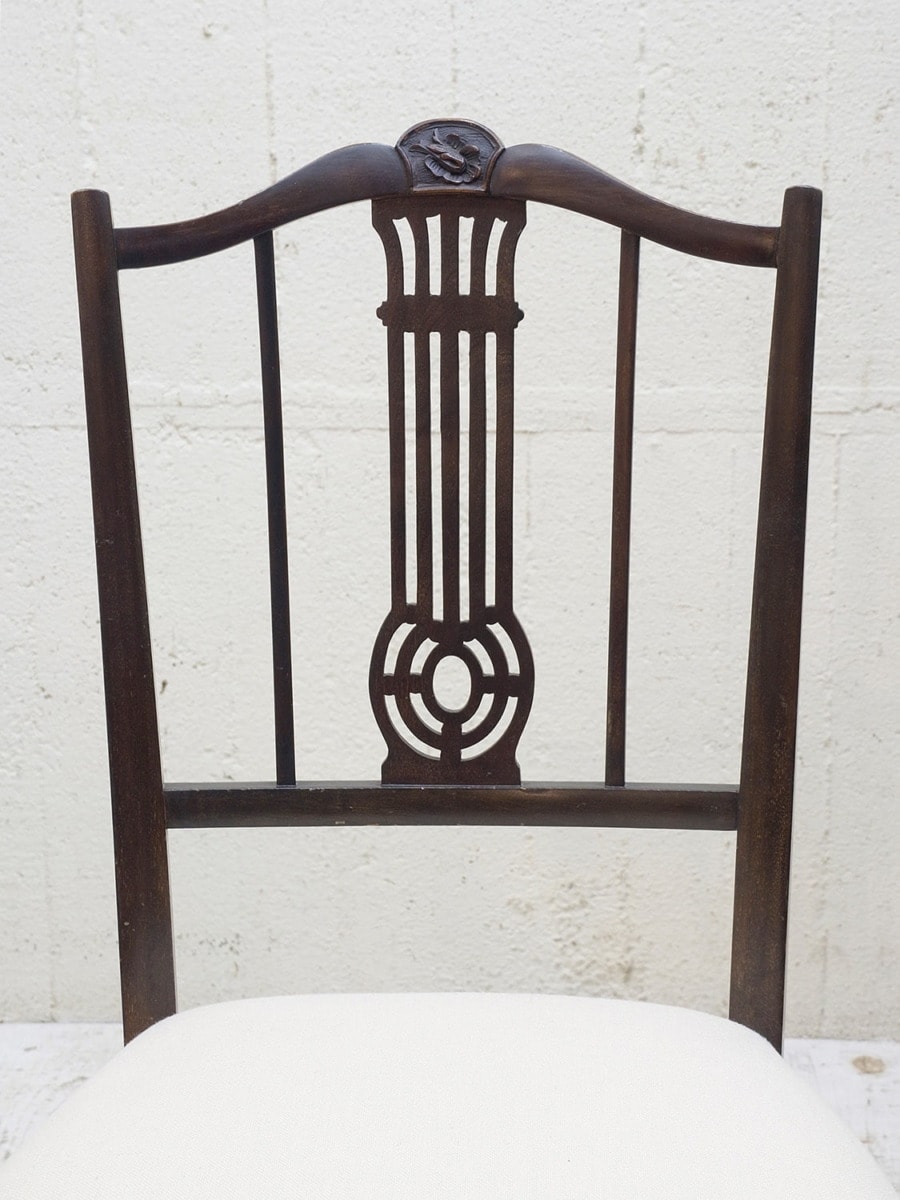 推定1900年代初頭、イギリス製アンティークマホガニーチェアです。。座面は入荷当時のままのオリジナルで、経年変化でところどころシミやスレがあります。上質なマホガニー材で作られていますが、とても軽く移動が楽に行えます。彫刻が繊細で、とても上品な椅子です。座面までの高さ44cm。価格は1脚の値段です。その他マホガニーチェアはこちらから。