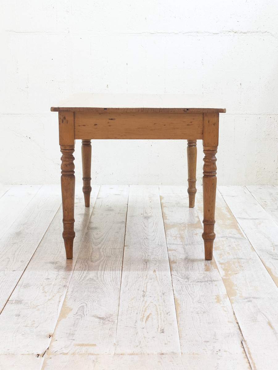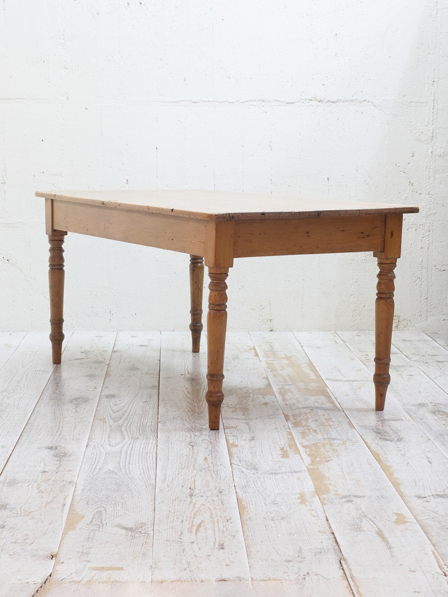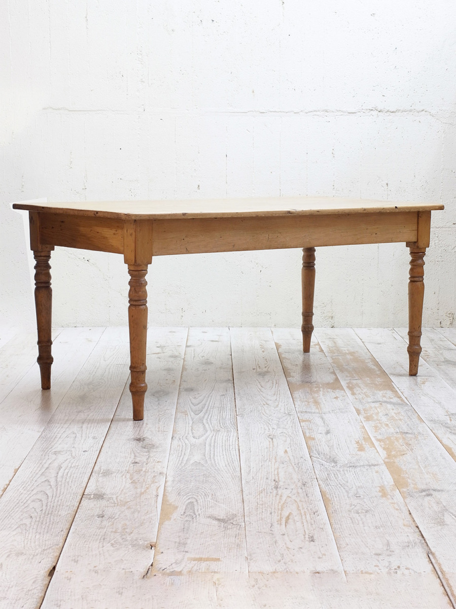 推定1920年代、イギリス製のアンティークパインテーブルです。全体的なバランスが良く、天板はフシも少なくきれいな木目です。ヴィクトリアンレッグと呼ばれる脚が特徴的です。4人掛けでゆったりのダイニングテーブルとしておすすめです。引き出しもなく究極にシンプルなデザインです。その他パインテーブルはこちらから。