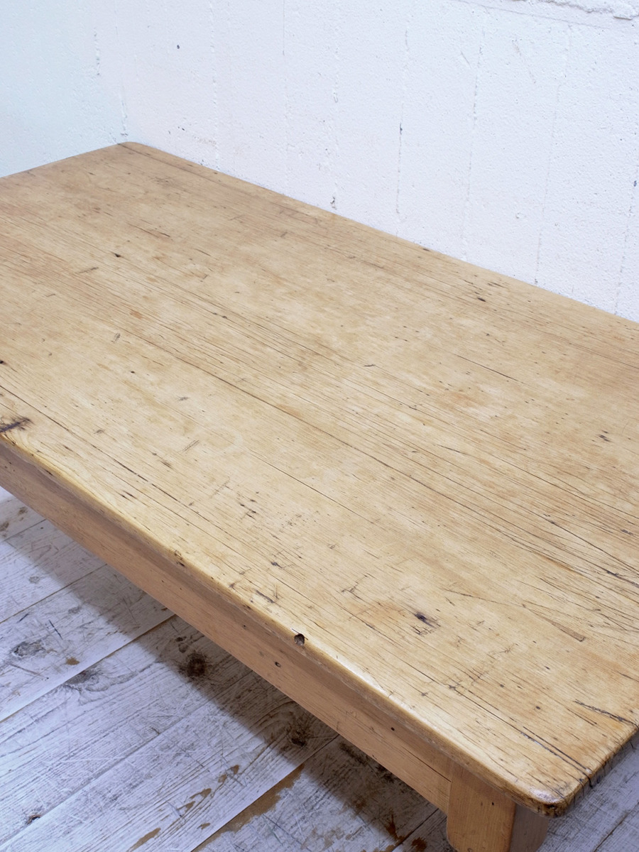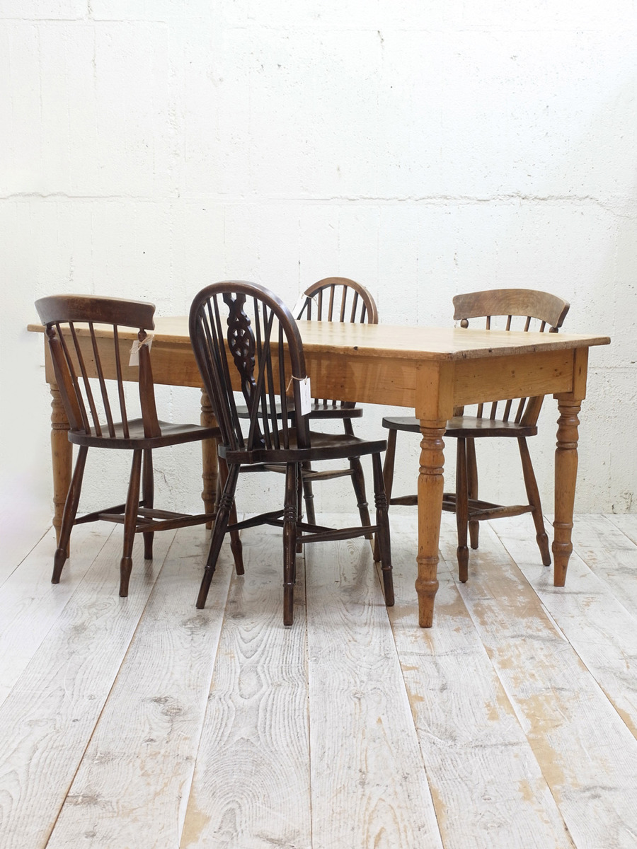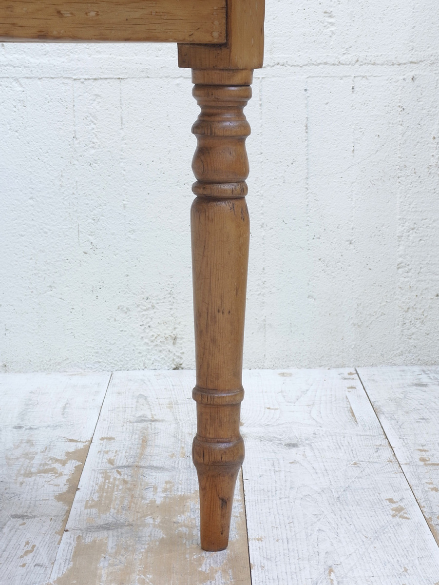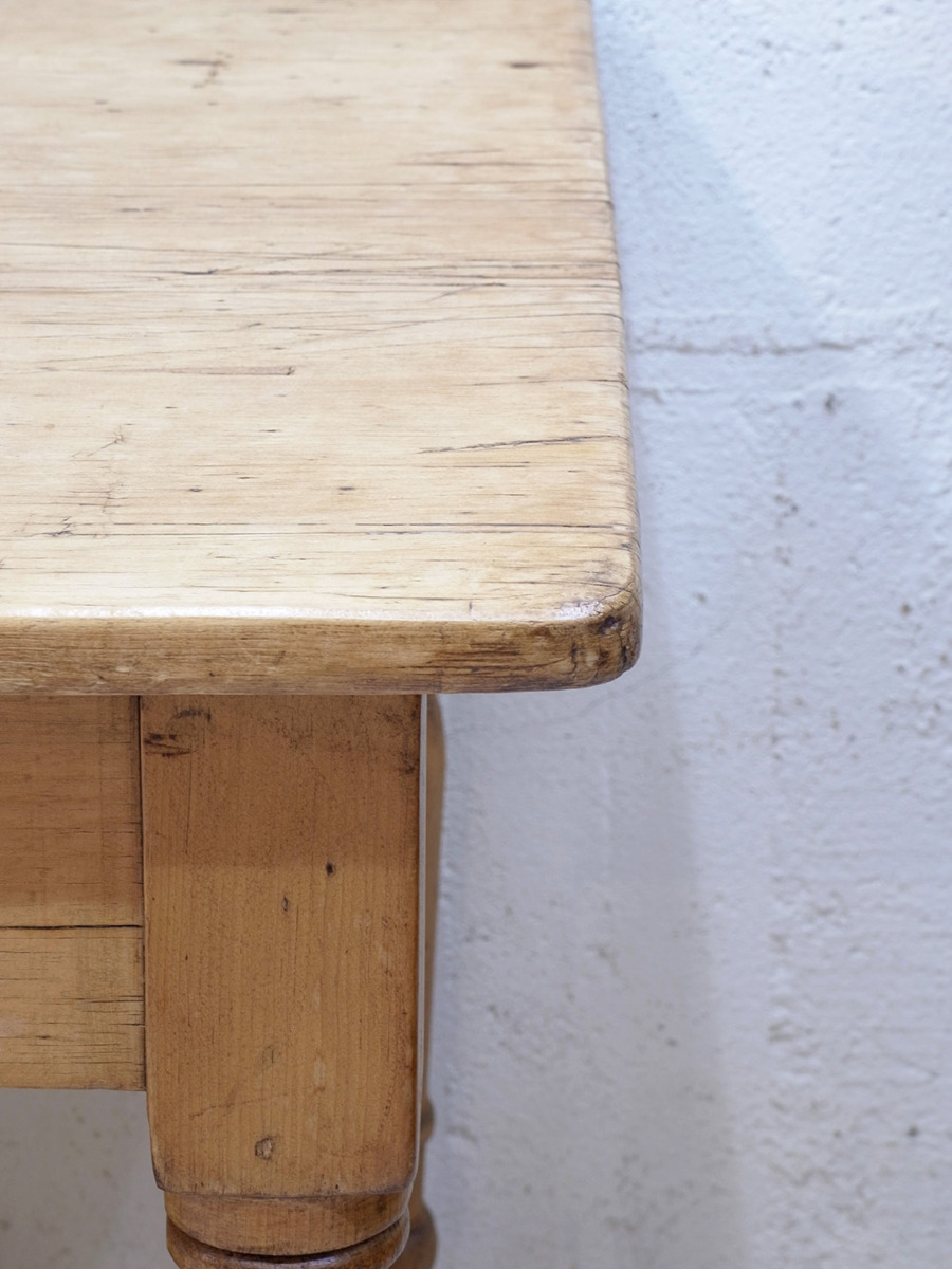 推定1920年代、イギリス製のアンティークパインテーブルです。全体的なバランスが良く、天板はフシも少なくきれいな木目です。ヴィクトリアンレッグと呼ばれる脚が特徴的です。4人掛けでゆったりのダイニングテーブルとしておすすめです。引き出しもなく究極にシンプルなデザインです。その他パインテーブルはこちらから。