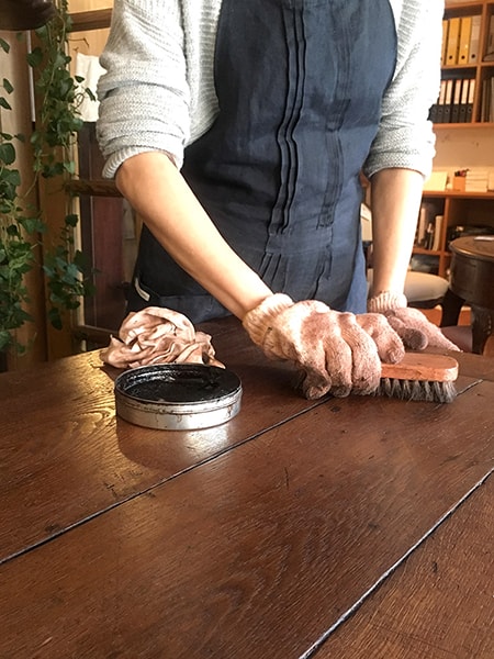 ワックス掛けのポイントは木目に沿って少量をうすくのばしていき、ワックスを塗りすぎないようにすることです。