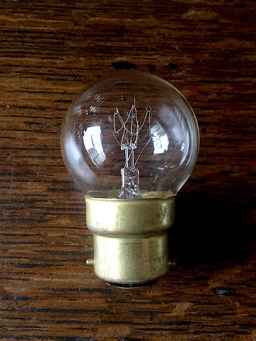 ソケットもオリジナルのままです。一般的によく売られている電球と少し仕様が異なり、通称イギリス球と呼ばれる電球を使用します。左右の出っ張りをソケットの金具に引っかけて固定します。画像で使用しているのはシャンデリア球というタイプでろうそく型ですが、丸いタイプもあります。
