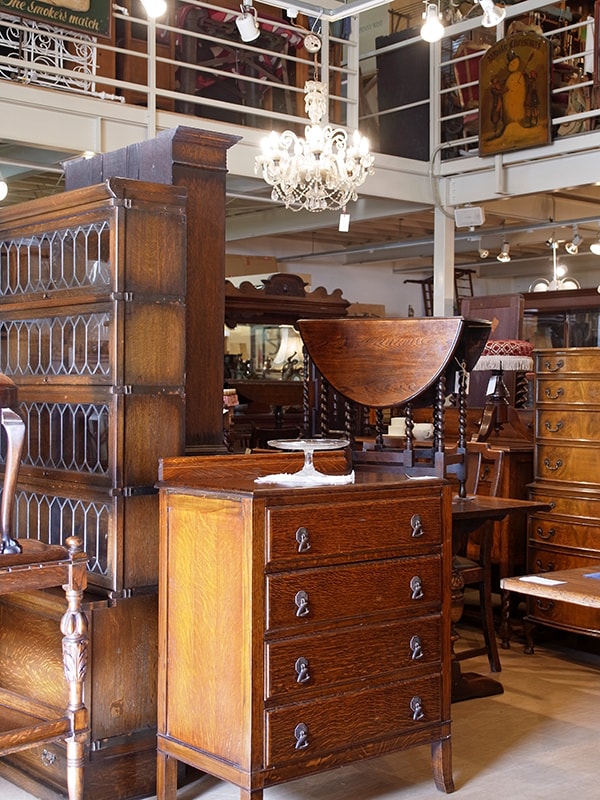 テーブルが3段に積みあがっていたコンテナ入荷直後とは変わり、少し見やすい配置で皆様をお待ちしいます。ダーク系の家具とアンティークパインの明るめの家具が約半々にディスプレイされています。