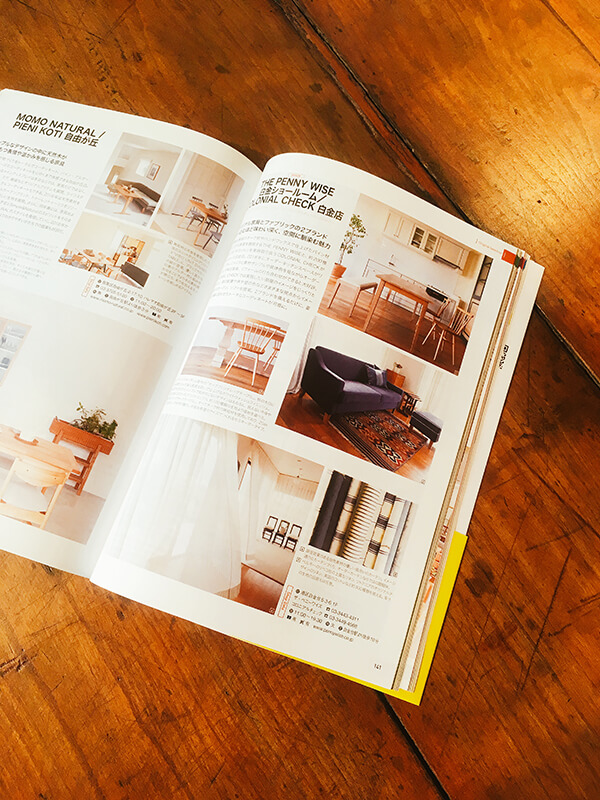 また、弊社のオリジナル家具、キッチンや壁面収納などオーダー家具をお受けしている白金ショールーム、自然素材にこだわったカーテンやソファなどの生地を扱うコロニアルチェックも載っていますのでぜひご覧ください(掲載ページP141)。