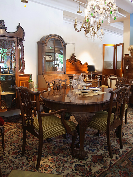 店内奥は、主に年代の古い重厚な家具を揃えました。相性抜群の上質な絨毯を