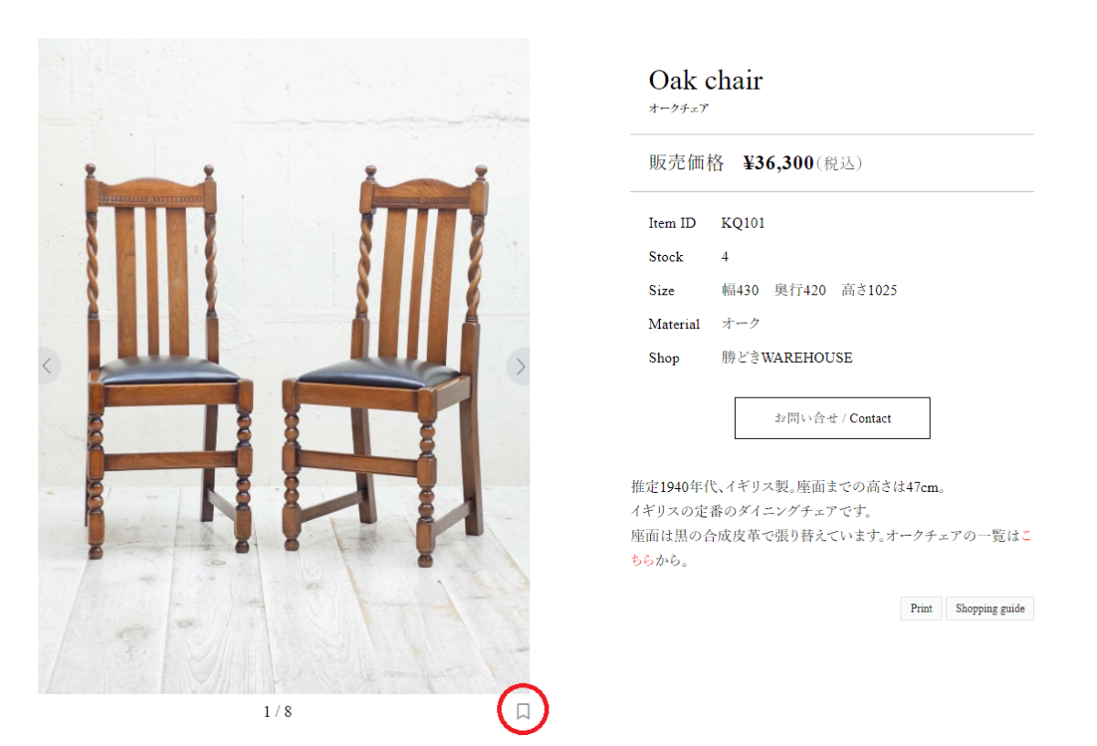 商品ページの画像の下にフラッグマークをクリックするとスマホではメニューバーのfavarite(パソコンの場合はトップページの右端にフラッグマークがあります)に追加できます。気になるアイテムを追加しておくと他のアイテムと比較検討しやすくなりますのでぜひご活用ください。
