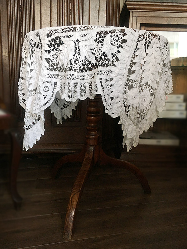 リネン生地を使ってボビンレースやニードルワークで仕上げられテーブル