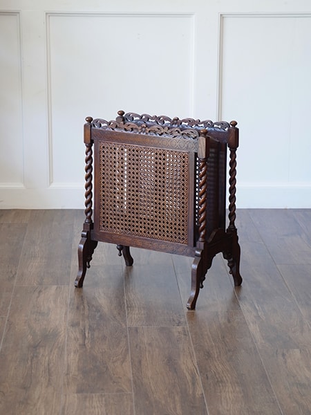 お花の彫刻が施され、籐の網目がきれいなサイドパネルなど繊細な印象です。持ち手があるので移動もできます。