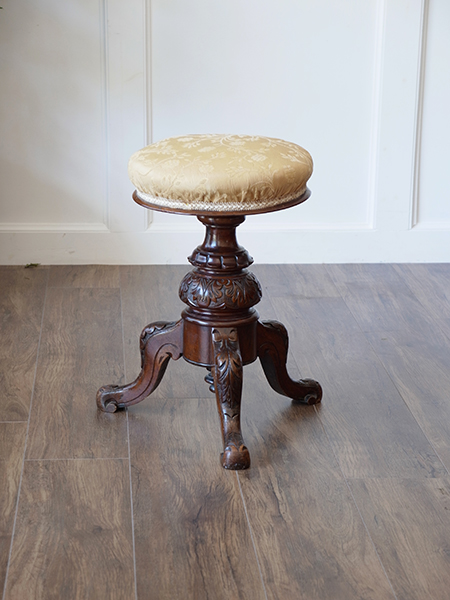 大人気のピアノスツールは、高さの調節が可能です。ヴィクトリアン時代の繊細な彫刻が施されています。