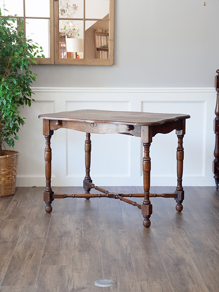 カービングのきれいなサプライズテーブルです。名の通り、天板の真ん中から折りたたまれた天板が出てきて奥行が長くなるテーブルです。脚のデザインもシンプルで素敵です。