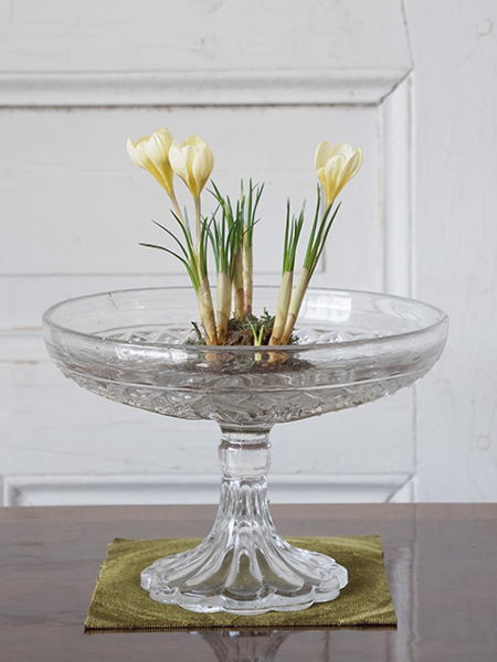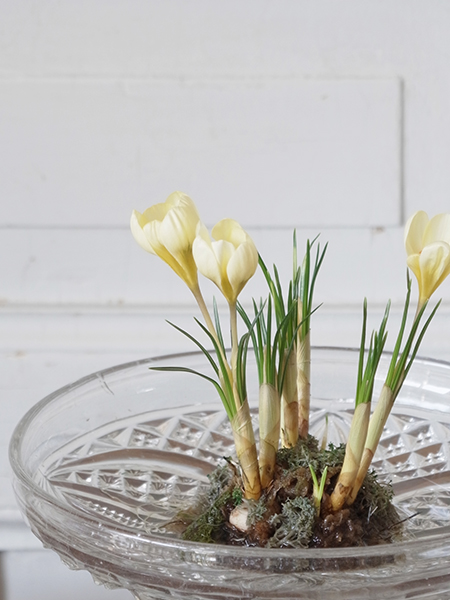 店内のガラスコンポートに生けたクロッカスの球根も花が咲き始めました!
