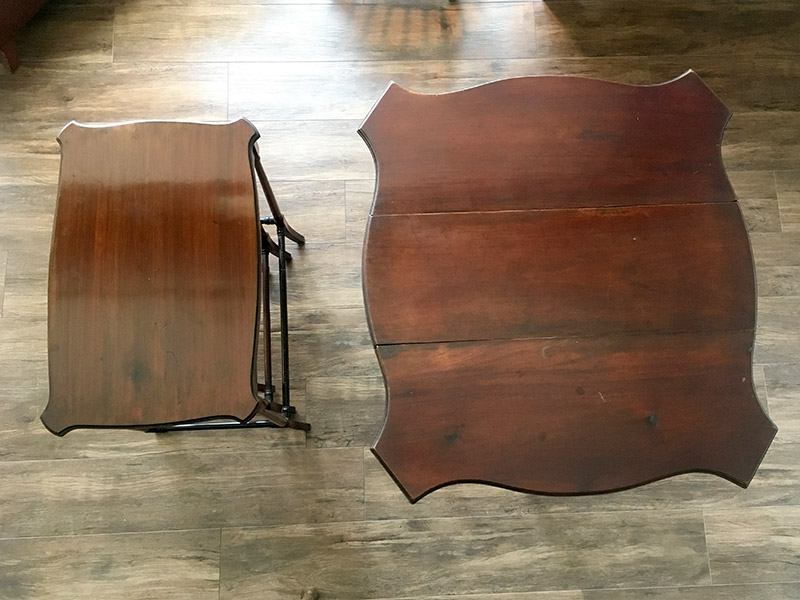 右側はKE120b マホガニーゲイトレッグテーブル。バタフライテーブルでサイドの天板が折りたためる機能的なテーブルです。天板を片方だけ平げ、壁付けにすればコンソールテーブルとしても使用できます。