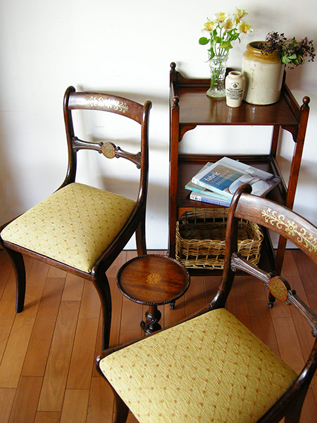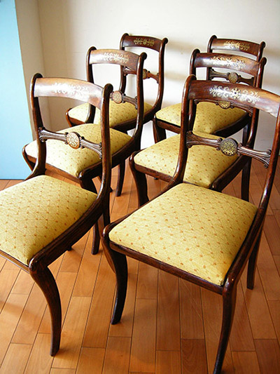 リージェンシースタイルのダイニングチェアが入荷しました。(推定19世紀初頭)希少なローズウッドで、トップレイルに繊細なブラスのインレイが入っていますイギリスにて、ジョージ4世が統治していた時代をリージェンシーと呼び、また、その頃に流行した様式がリージェンシースタイルです。