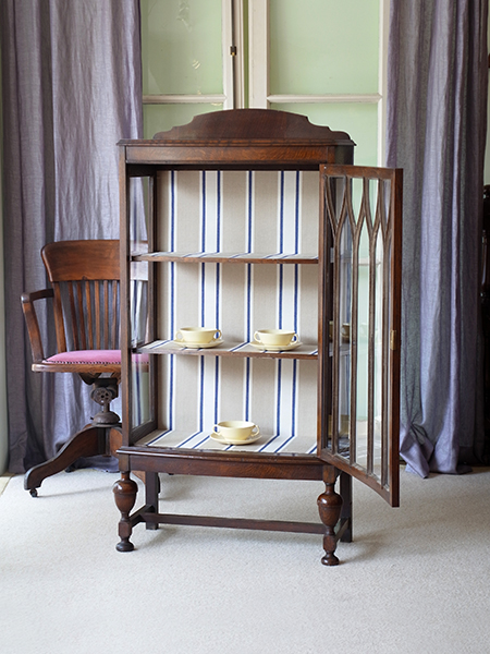 オークのショーケースはコロニアルチェックの新作生地Marpal 5で張り替えました。オーク材との相性が良く、太めのストライプでモダンな印象に様変わりしました。KX143-7